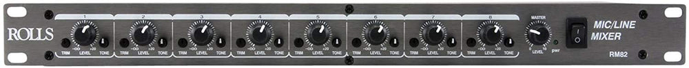 The RM82 is an eight channel mixer in a single rack space intended for a variety of sound reinforcement applications including board rooms, churches, mixing console expansion etc. Virtually any application where up to eight microphones need to be mixed together, and space is limited, is met by the RM82. Each of the eight channels has an XLR microphone input, as well as a 1/4” unbalanced input. The 1/4” jacks may be internally reconfigured to become channel Inserts or Direct Outputs. Inserts provide a way to get each individual channel signal in and out of the RM82 mainly for processing purposes. A Direct Output is simply taking the signal from the channel only. Each channel has individually switchable +48 VDC phantom power. The RCA Prefade (pre Master Level) Output may be connected to the RCA Aux Buss Input for cascading two RM82 units together. This Output may also be used for recording purposes, and the Aux Buss Input . The Main output for the RM82 is a balanced male XLR jack. This output may be internally jumpered for a Line or Mic level.