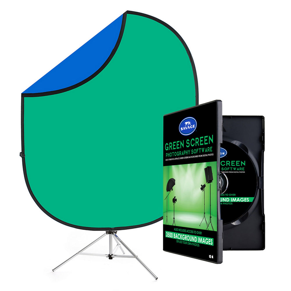 Designed for use in studio and on location, the Savage Green Screen Digital Photography Kit includes a collapsible and reversible chroma key background, aluminum background stand, and our Green Screen Wizard software (with 3,500 themed digital backgrounds) for dropping in and removing photo backgrounds with ease.