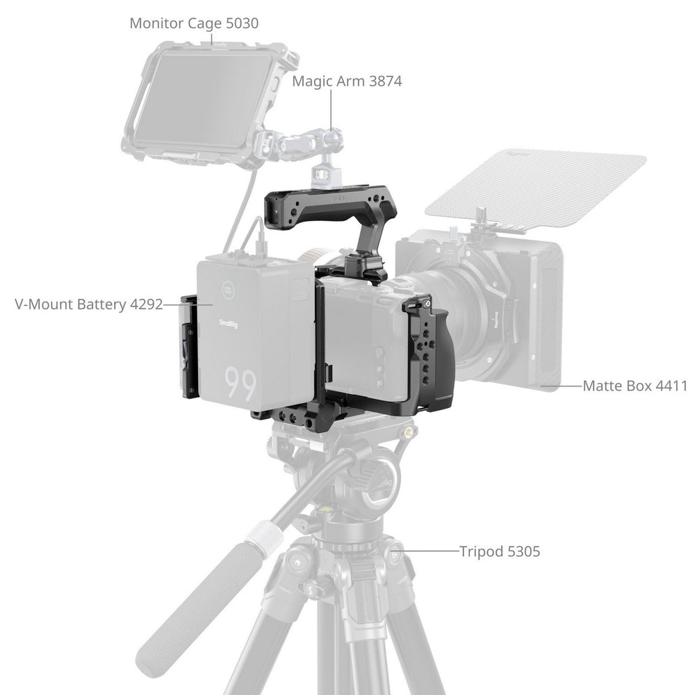 This cage kit supports streamlined on location workflows by combining power mounting, accessory expansion, and quick release functionality in a compact form. Its metal construction is suited for professional use while maintaining portability. The included handle enhances control for low angle and handheld shooting scenarios.
