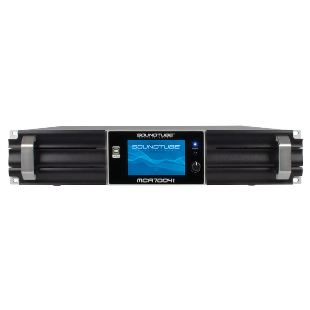 The MCA7004t (700W/ch at 4 Ω) and MCA10004t (1000W/ch at 4 Ω) are networked DSP matrix amplifiers featuring Dante™/AES67, offering powerful and flexible multichannel audio distribution. Each offers four channels of amplificationW with built-in DSP control for routing, EQ, delay, dynamics, and presets via a 4.3″ touch screen and STNet MCA Control software.