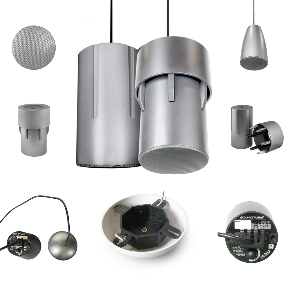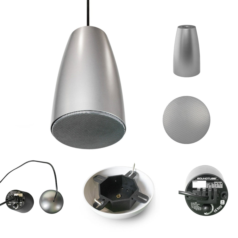 - DS31-EZ-CS-SL: 1x DS31-EZ Pendant Speaker, 1x Cylindrical Sleeve – Silver, 1x Magnetic Grille – Silver, 1x Surface-Mount Bracket – Silver