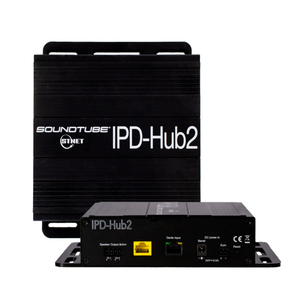 The IPD‑HUB 2 is a two‑channel DSP amplifier powered via PoE/PoE+ or a 24 V DC power supply, designed for Dante/AES67 networked audio distribution. It is engineered for scalable commercial installations using passive loudspeakers and delivers up to 12 W per channel over 40 W PoE power.