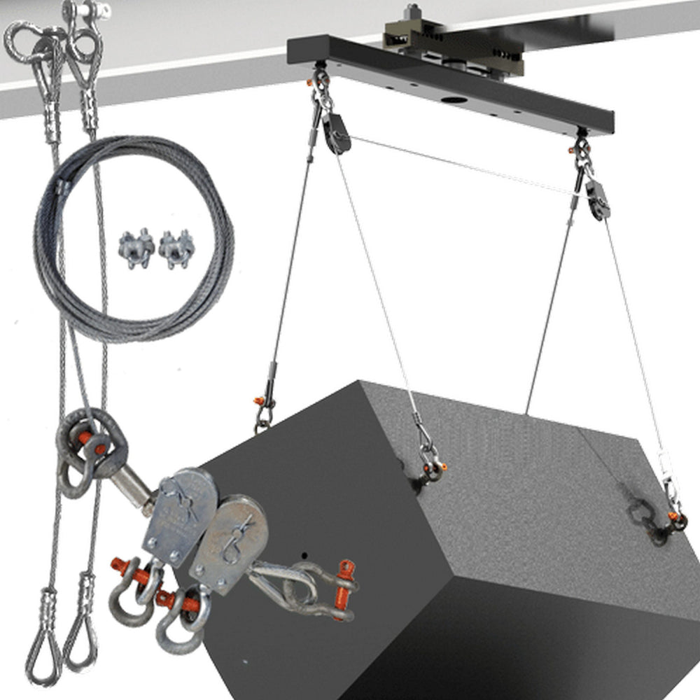 Steerables Double Tilt Cable Kits are a general purpose, time saving and complete loudspeaker suspension and aiming solution. This versatile aircraft cable and pulley design allows installers to secure loudspeakers from an overhead grid structure or other suspension device, then quickly and precisely tilt them into position using the adjustable pull back feature. The Steerables Double Tilt Cable Kit provides a simple method of suspending and aiming loudspeakers, offering unprecedented ease of installation and aiming. Loudspeakers and other objects can be suspended to the top of the cabinet to achieve just slight down tilt angles or be suspended from the back of the cabinet to achieve a steeper down tilt angle.