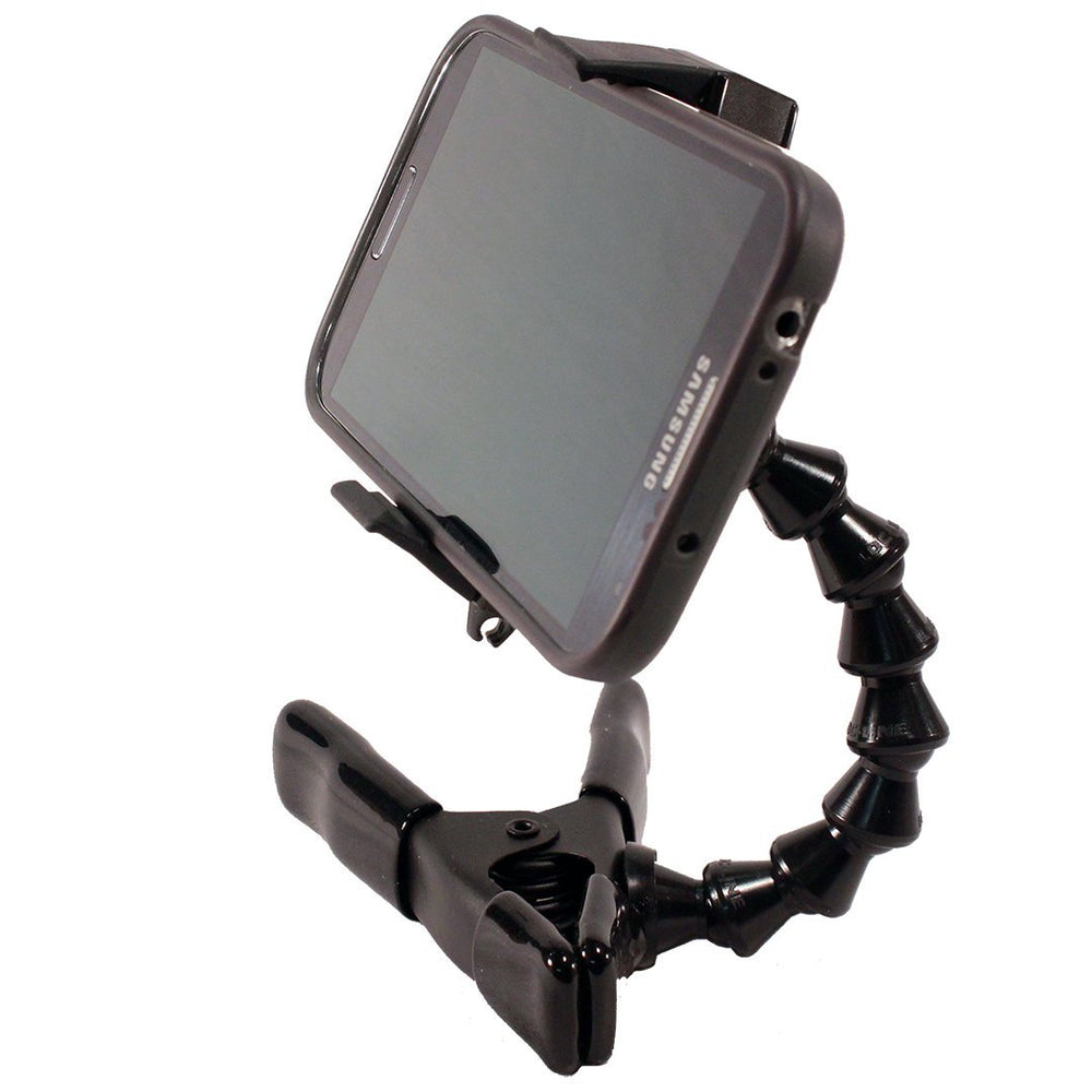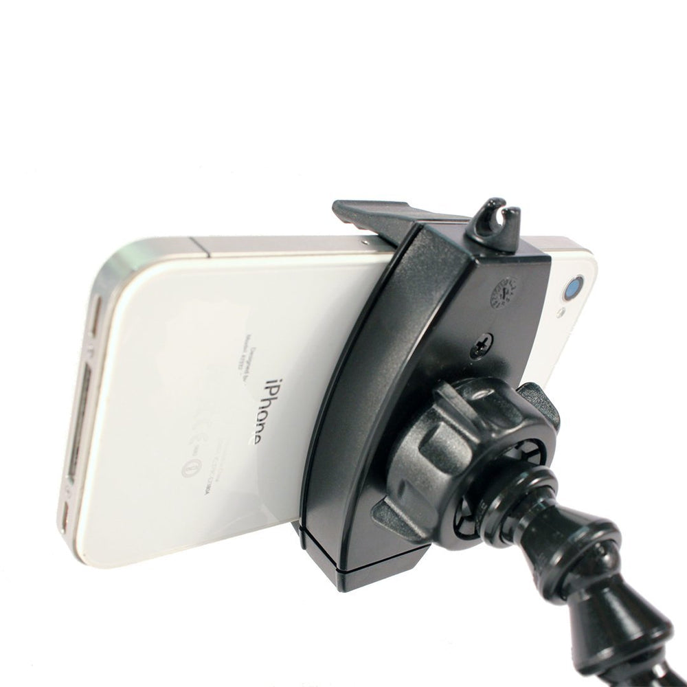 Clamp your phone virtually anywhere! Stage Ninja’s spring-loaded phone holder accommodates smartphones (even those with skins or ruggedized cases) up to 3.6 inches wide. Five inches of scorpion flex stays where you position it. The industrial steel, tension-loaded 4.25 clamp base with anti-mar jaws opens to just over 1. Not only does the FON-9-CB clamp to objects, it also works as an excellent stand on ANY flat surface!