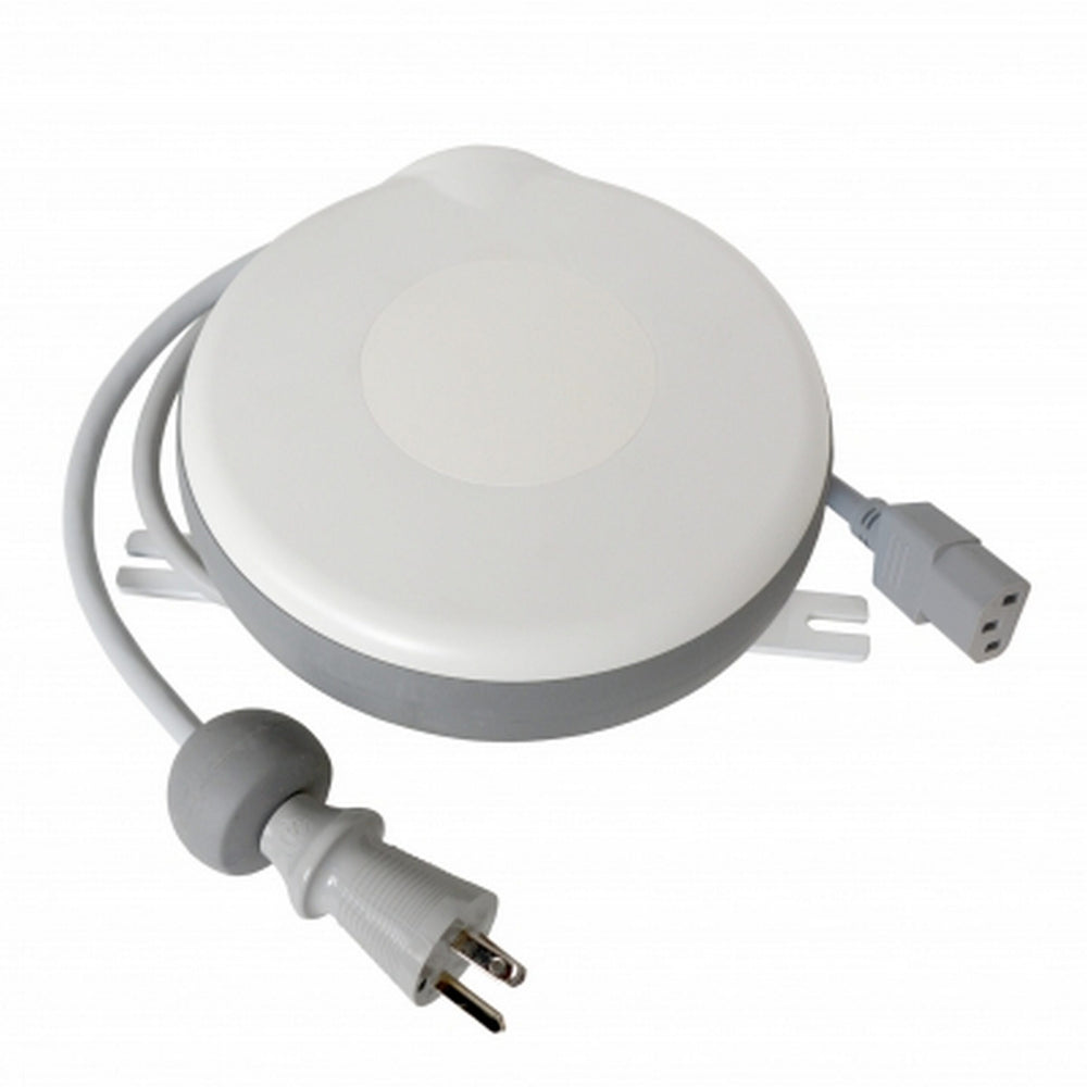 Durable 14/3 retractable power cable with 5-15P antimicrobial hospital grade plug in housing with antimicrobial agent. Static end is 16/3 power cable with a single IEC 320 C-13 female tap. Pull cable to desired length (it locks in place); give the cable another pull to unlock. Cable instantly retracts into protective housing. This reel meets standard UL 60601-1 and has a maximum power of 10 amps and 125 volt rating. The durable high impact plastic housing is molded with a permanent antimicrobial additive and comes standard with a flat mounting strap that can be fastened to a horizontal surface like a cabinet, or rack mount. A vertical mounting bracket kit is available. Eliminates cord winding, cord tangles and trip hazards with instant cable retraction. This is an excellent reel for sterile, mobile applications.