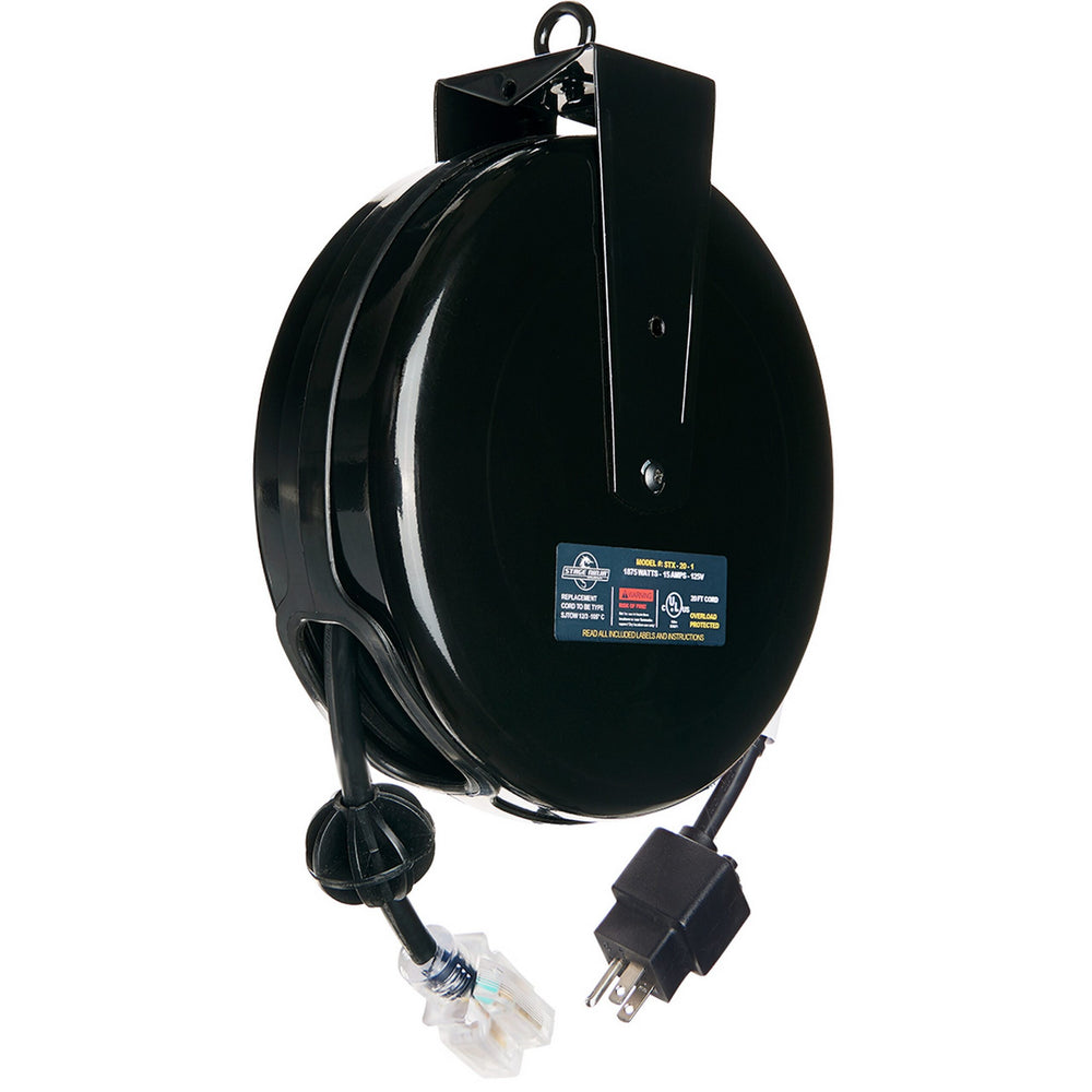 Durable 12/3 power cable with over molded connectors for longer life. Pull cable to desired length (it locks in place); give the cable another pull to unlock. Cable instantly retracts into protective housing. The retractable cord is 20 feet with single tap female LED power indicator end. The static cord is 3 feet with male plug and 15 amp on-board circuit breaker. The durable black powder coated steel housing comes with an eye hook and optional swivel wall or ceiling mounting bracket. Constant tension is available upon request. Eliminates cord winding, cord tangles and clutter with instant cable retraction.