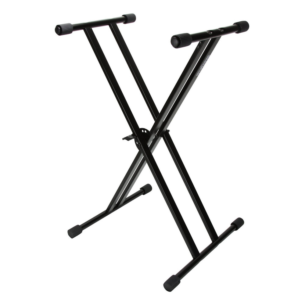 * Clutch-less, spring-loaded height adjustment pin * Rubber caps on feet to adjust to uneven surfaces * Double braced X design breaks down with a single Allen wrench * Perfect for small to full size keyboards, DJ and sound equipment, and more