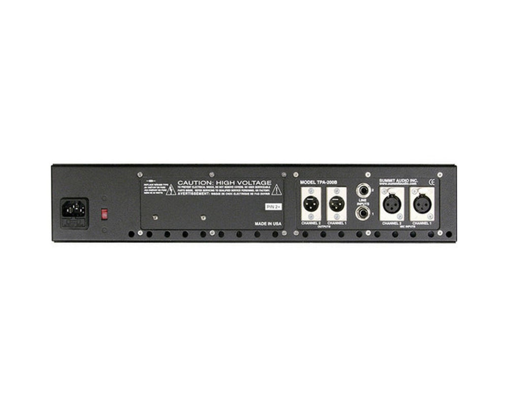 The Summit Audio TPA-200B Dual Tube Microphone Preamplifier is dual-channel, tube/solid state hybrid microphone preamp featuring 3 input types - microphone input, line level input and front panel Hi-Z input. The unit is equally suited for tracking and mixing duties due to the constantly variable input and output gain that can overdrive the tubes in any amount.
