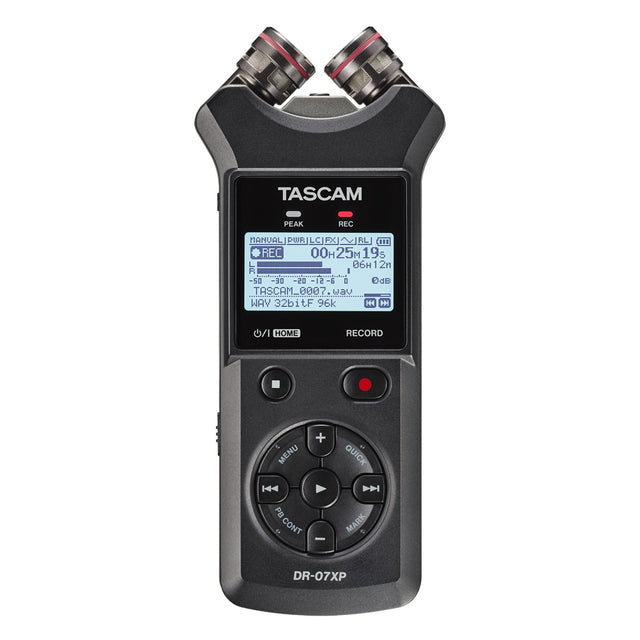 The TASCAM DR-07XP is a portable 2-channel handheld audio recorder designed to make high-quality recording simple and reliable in real-world environments. With flexible WAV and MP3 recording options—including 32-bit float capture—this recorder helps you preserve clean audio whether you’re tracking loud sources, recording interviews, capturing rehearsals, or building content for video.