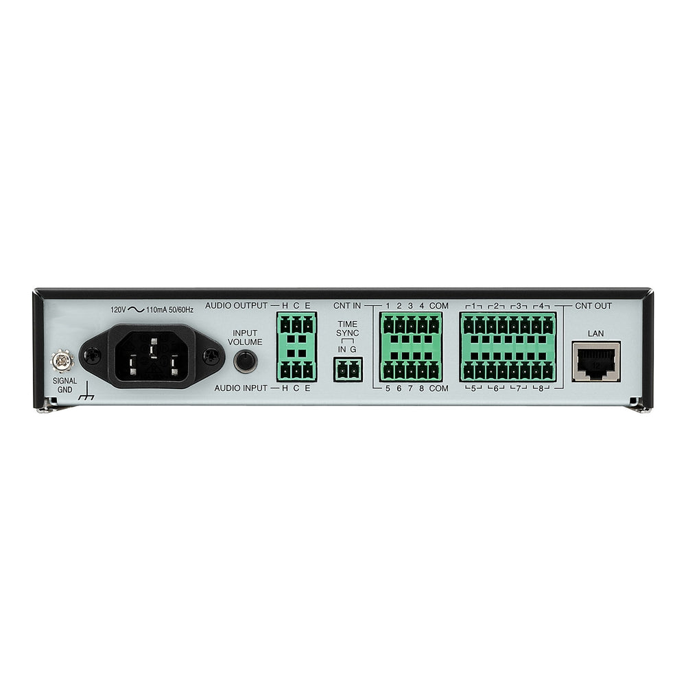 - Offers one MIC/LINE audio line input, one audio line output, eight contact inputs, time synchronization input, built-in timer, and chime.