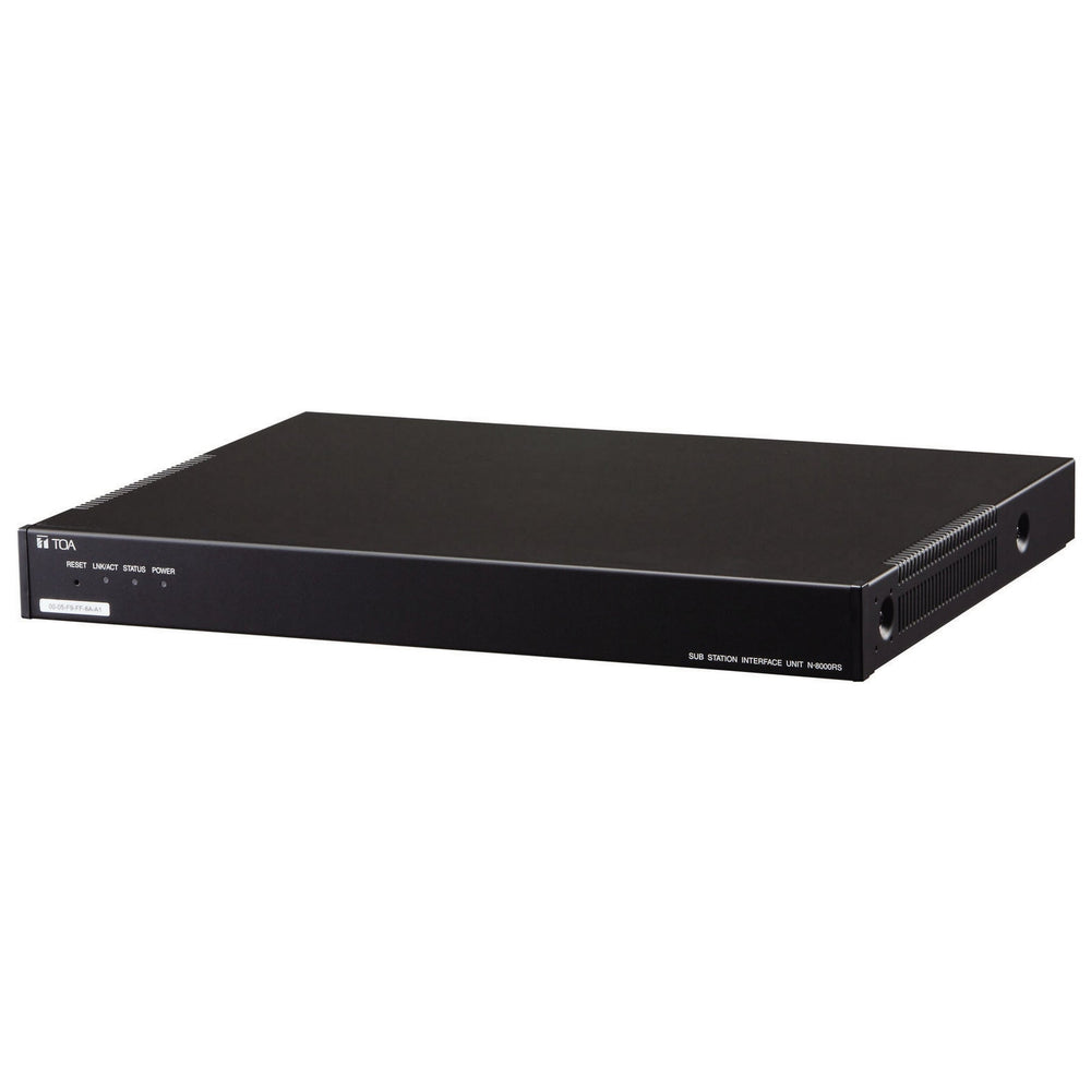 The TOA N-8000RS Sub Station Interface Unit for RS-1 Series uses packet audio technology to connect up to 16 RS-1xx series call switches or door stations. It is crucial to use shielded twisted pair cables for connecting both call switches and door stations. Each port can supply 1W @25V to a door station or a 25V loudspeaker connected to a call switch. Each N-8000RS unit supports 2 voice links and needs either an IP master station or a connection to a 2-wire or 4-wire Exchange with at least one master station on the exchange.