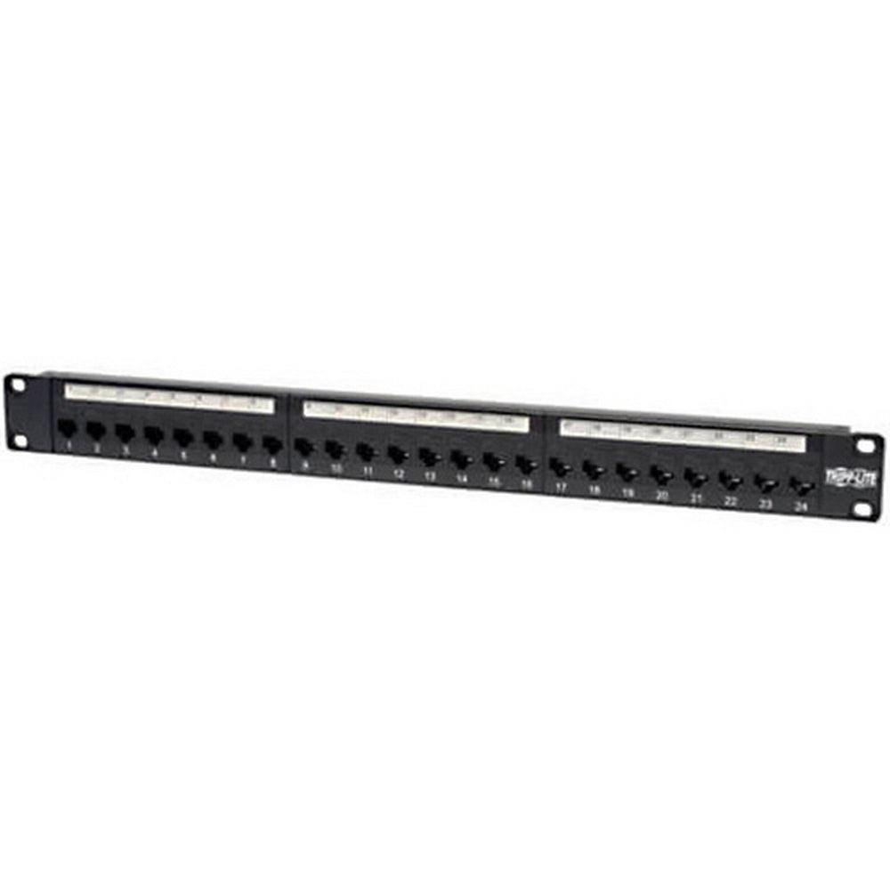 Tripp LIt's N254-024 24-Port Cat6 Feed-Through patch panel provides patching without punching down bulk wire to the back of the panel. Fully meets or exceeds Cat6 specifications - works with USOC, T568A, and T568B wiring. 19" width mounts easily in 2-Post Relay Rack or a Wall-Mount Hinged Rack. Detachable cable management bar keeps patch cables neat and tidy on the back of the panel. Tripp Lite Lifetime warranty.