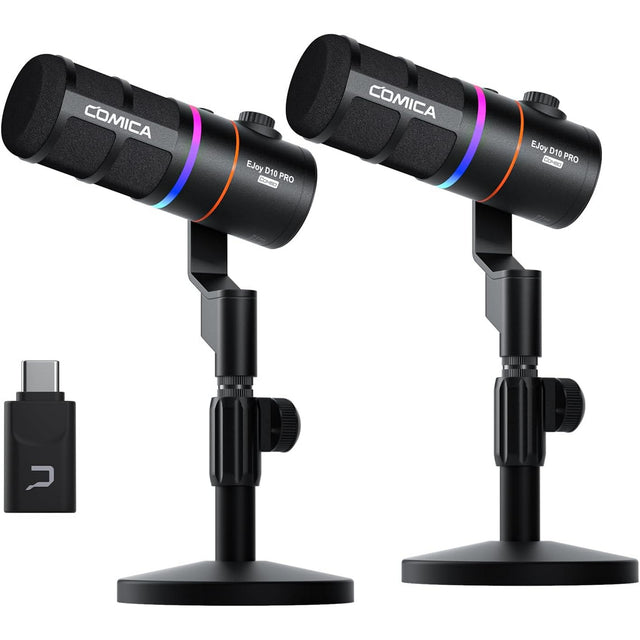 The Comica EJoy D10 Combo Dual Channel Wireless USB Gaming Microphone is a two person dynamic microphone system designed for podcasts, streaming, co host shows, and collaborative content creation. Each microphone uses a cardioid pickup pattern to focus on the speaker while helping to reduce room noise and distractions. With both wired and wireless modes plus USB C and XLR outputs, this combo set is built to fit into gaming rigs, studio setups, and mobile production workflows.