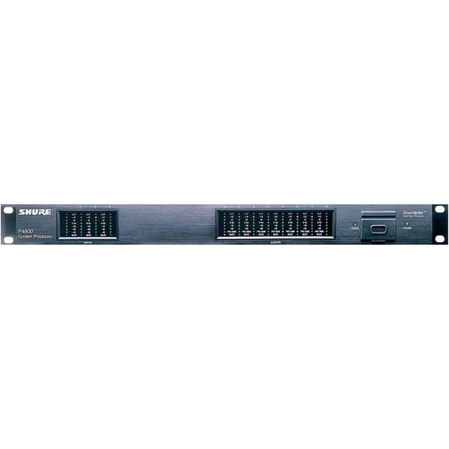 The Shure P4800 is a 1U rack-mounted digital audio processor that combines a flexible 4-input by 8-output matrix mixer with powerful DSP to optimize sound in installed and live reinforcement systems. Positioned between your mixer and amplifiers, it delivers precise routing, equalization, dynamics, and delay with dependable performance.