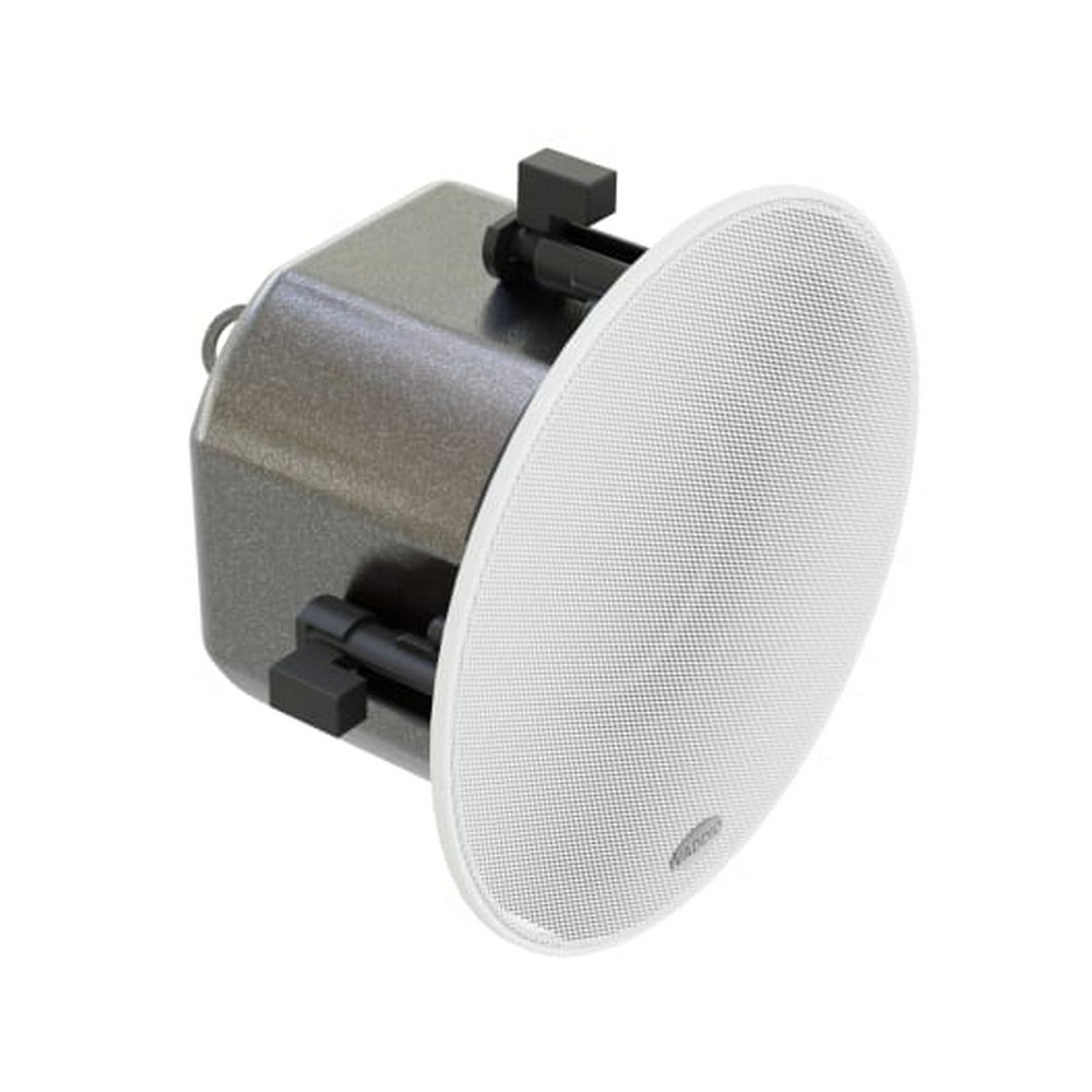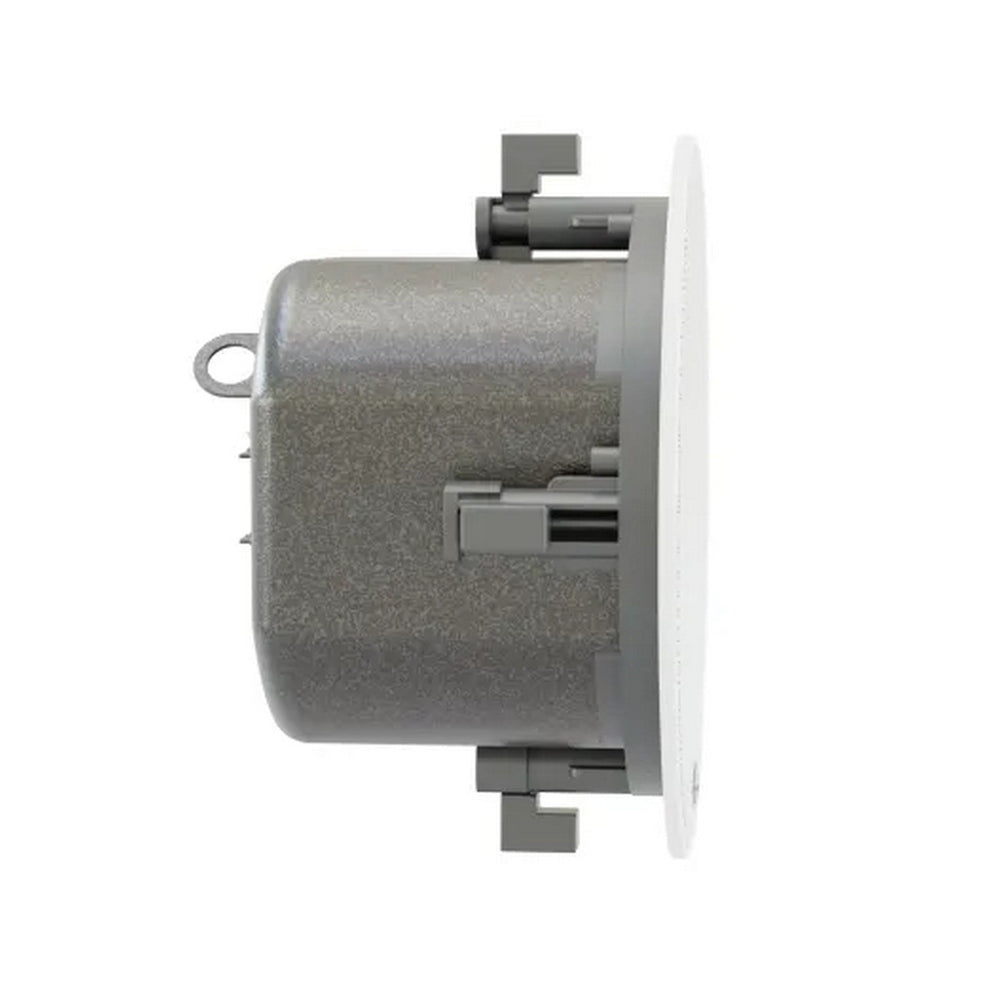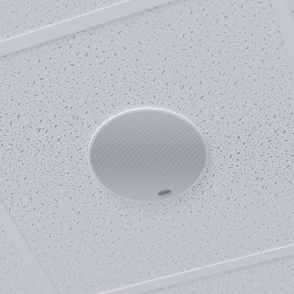 Its flush-mount design allows for installation in ceilings or walls up to 1-3/8 inches thick, and the magnetically attached white metal grille provides a streamlined appearance while allowing easy access to the swivel-out mounting tabs. The air-sealed steel enclosure includes a recessed cable cavity and an RJ-45 connection for Dante networked audio, simplifying installation and reducing cable clutter.