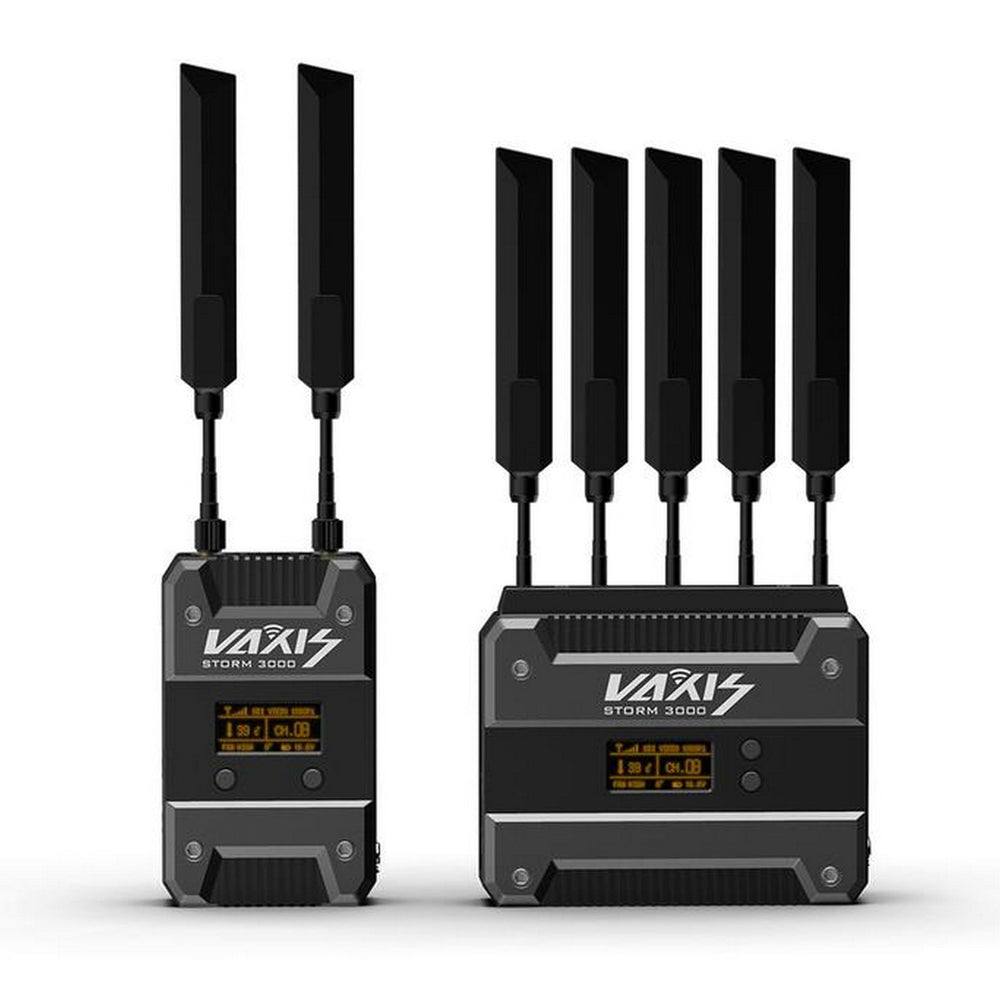 The Storm 3000 from Vaxis features a 3000' range and supports up to 1080p60 uncompressed signal transmission with less than 1 ms of latency over the 5.1 to 5.9 GHz frequency. The transmitter features 3G-SDI and HDMI inputs plus a 3G-SDI loop output, and the receiver has dual 3G-SDI simultaneous outputs and an HDMI output. Both units come with V-mount battery plates. Both also support continuous power via 2-pin LEMO power inputs. Two D-Tap to LEMO cables are included.