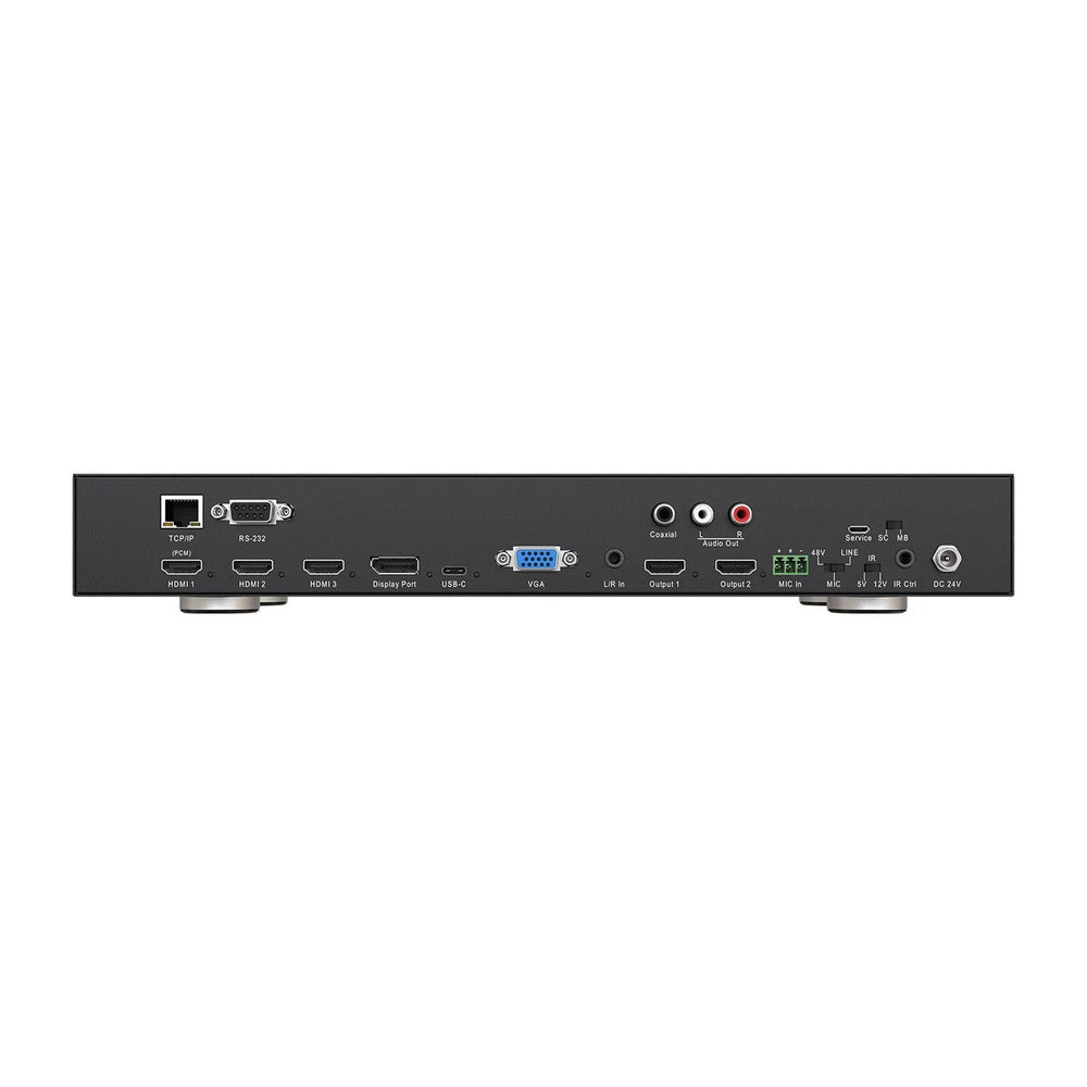 The BG-PSC6X2-4K is a Multi-function 4K@60Hz (4:4:4) Presentation Switcher/Scaler. It has 6 inputs including HDMI, VGA, USB-C and DisplayPort. All inputs can be routed to either of the 2 HDMI display outputs. Easily switch between sources using the front panel controls, IR remote, RS-232 or TCP/IP connections. Manual EDID and Scaler DIP switches makes It'simple to customize for each application. Embed your external audio source via the L/R 3.5mm port or de-embed audio from the Source inputs using the Digital Coax or Analog RCA connections. Additionally, this unit offers a microphone input including phantom power with a 48V optional DIP switch.
