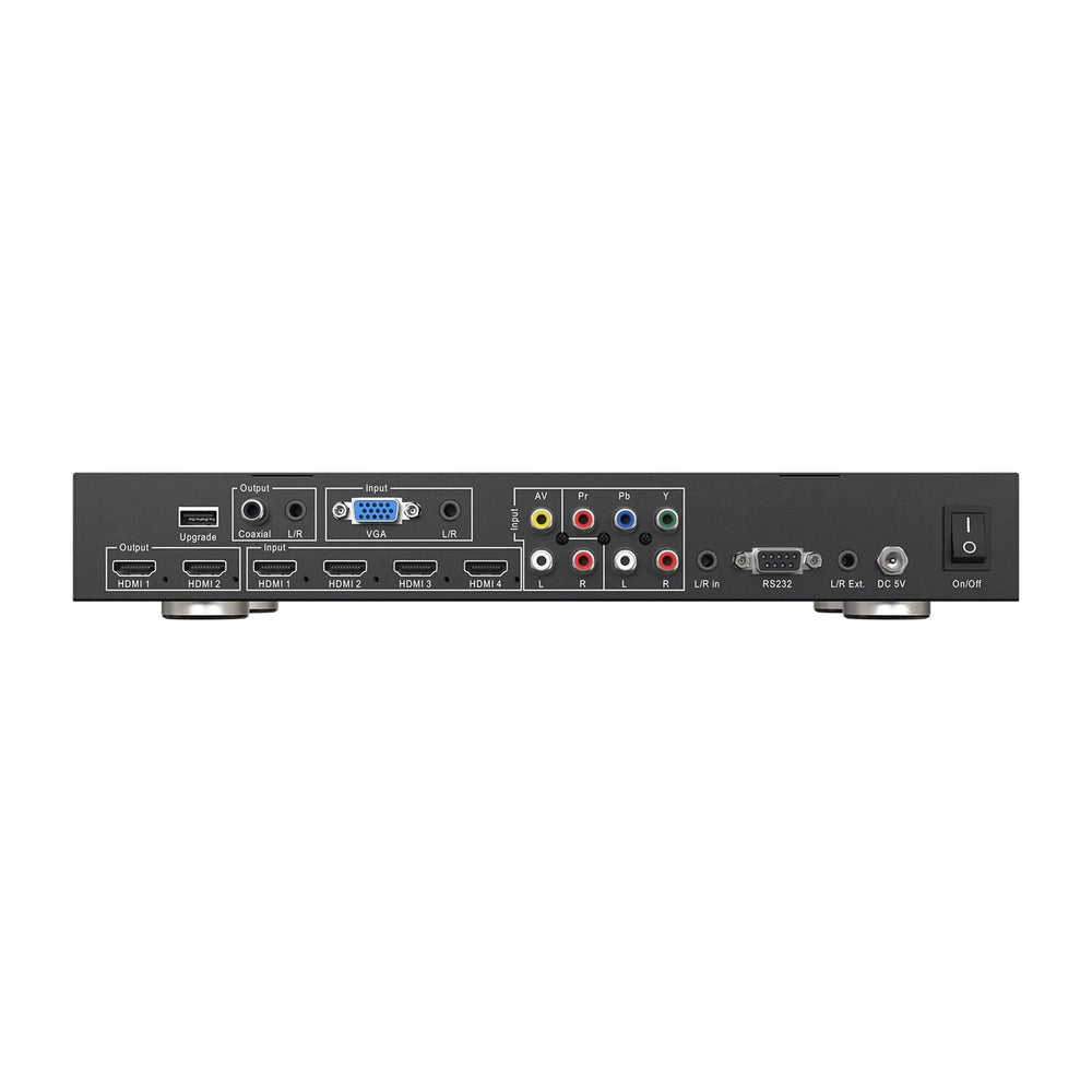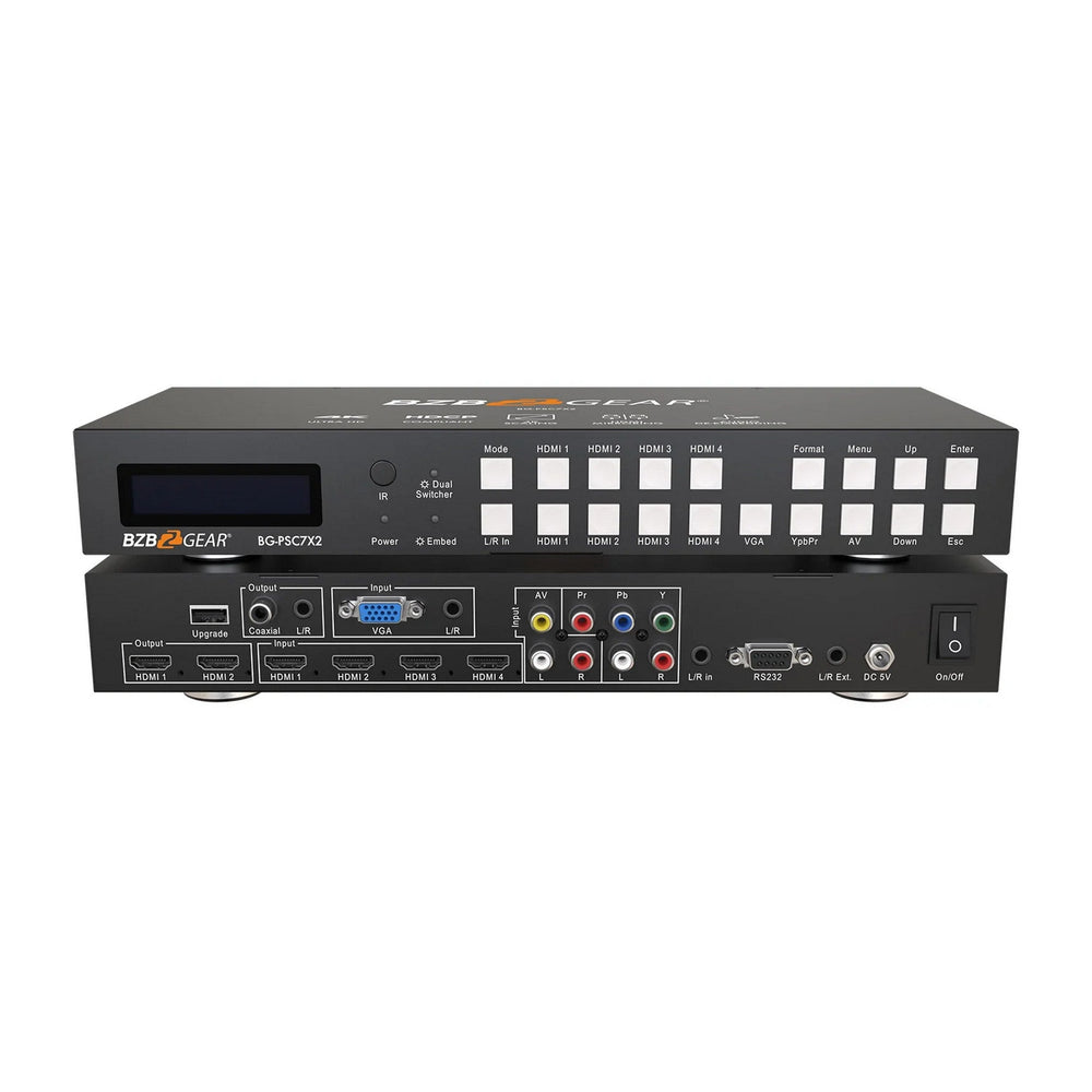 The BG-PSC7X2 is a Multi-function 4K Presentation Switcher/Scaler. Outputs are scaled to 1080P with the ability to pair one HDMI input and output for 4K passthrough. It has 7 inputs including 4xHDMI, VGA, Component and Composite. All inputs can be routed to either of the 2 HDMI display outputs. Easily switch between sources using the front panel controls, IR remote, RS-232 or TCP/IP connections. Manual EDID and Scaler DIP switches makes It'simple to customize for each application. Embed your external audio source via the L/R 3.5mm port or de-embed audio from the Source inputs using the Digital Coax or Analog connections.