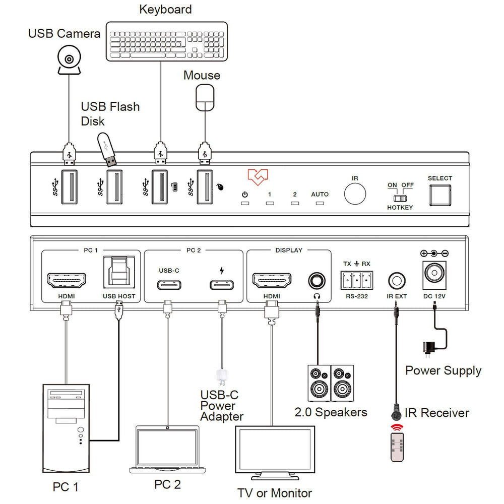 - Multiple switching methods: front panel buttons, IR remote control, keyboard/mouse hotkeys, and RS-232 commands.