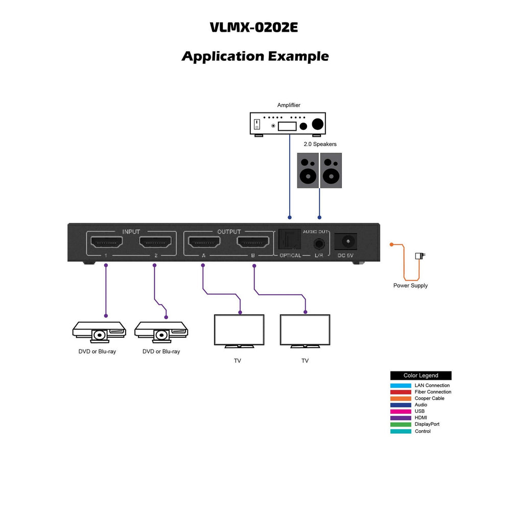 Engineered for reliability, the VLMX-0202E ensures smooth and consistent operation in various environments with its wide operating temperature range and low power consumption. The splitter is housed in a sleek black metal enclosure, making it both stylish and functional. It’s the perfect addition for anyone looking to elevate their AV experience with reliable, high-quality video and audio distribution.