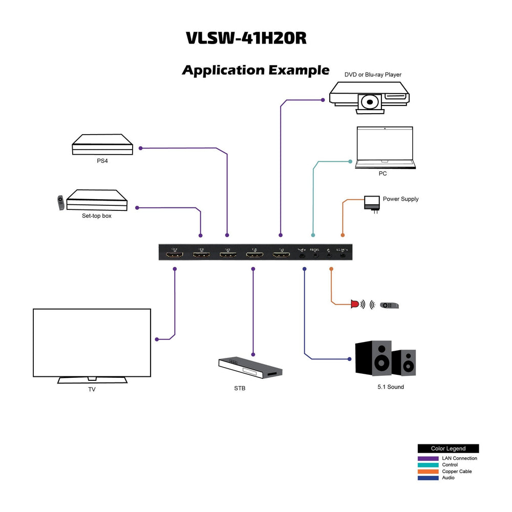 Designed with user convenience in mind, the VLSW-41H20R offers multiple control options, including an IR receiver and RS232 port, facilitating seamless integration into existing control systems. Its compact dimensions and lightweight design make it easy to install in various environments, from home theaters to professional AV setups. With HDCP compliance (versions 1.4 and 2.2) and a robust 18Gbps video bandwidth, the VLSW-41H20R ensures compatibility with the latest HDMI standards and delivers a smooth, uninterrupted viewing experience.