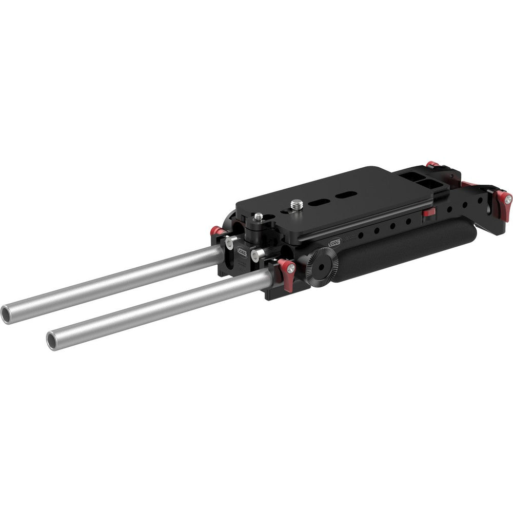 The USBP-15 MKII is compatible with most cameras thanks to its height-adjustable front rails. Standard rosettes are located on both sides of the plate, allowing for the attachment of handgrips or other accessories. The bottom of the plate features magnets, enabling multiple shoulder pads to be mounted to different positions underneath the baseplate. It attaches directly to VCT-14 style quick release plates and includes a toolless VCT-14 rear adjustment to prevent any play. Fixed rear rails provide the option to mount any 15mm rail accessory, like a battery, recorder, or monitor, to the back of the camera.