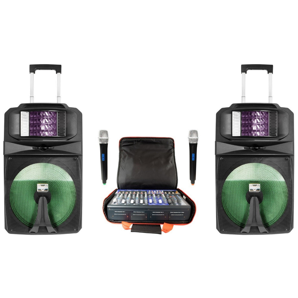 The VocoPro BAND-GO 2000W PA System 2 Microphones and 2 Speakers features the WirelessMix eight-channel mixer, two wireless vocal microphones, and two 1500-watt Thunder-1500 powered speakers equipped with Pro Derby Lights directly integrated, optimizing both space and setup time.