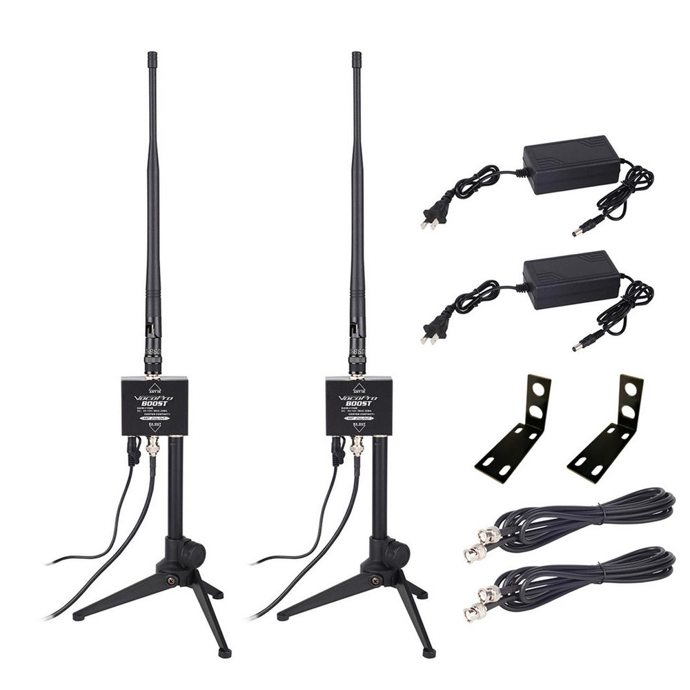 • All-inclusive package with two antenna boosters, power supplies, plug adapters, 8 foot coaxial antenna cable, wall mount bracket, and table stand.