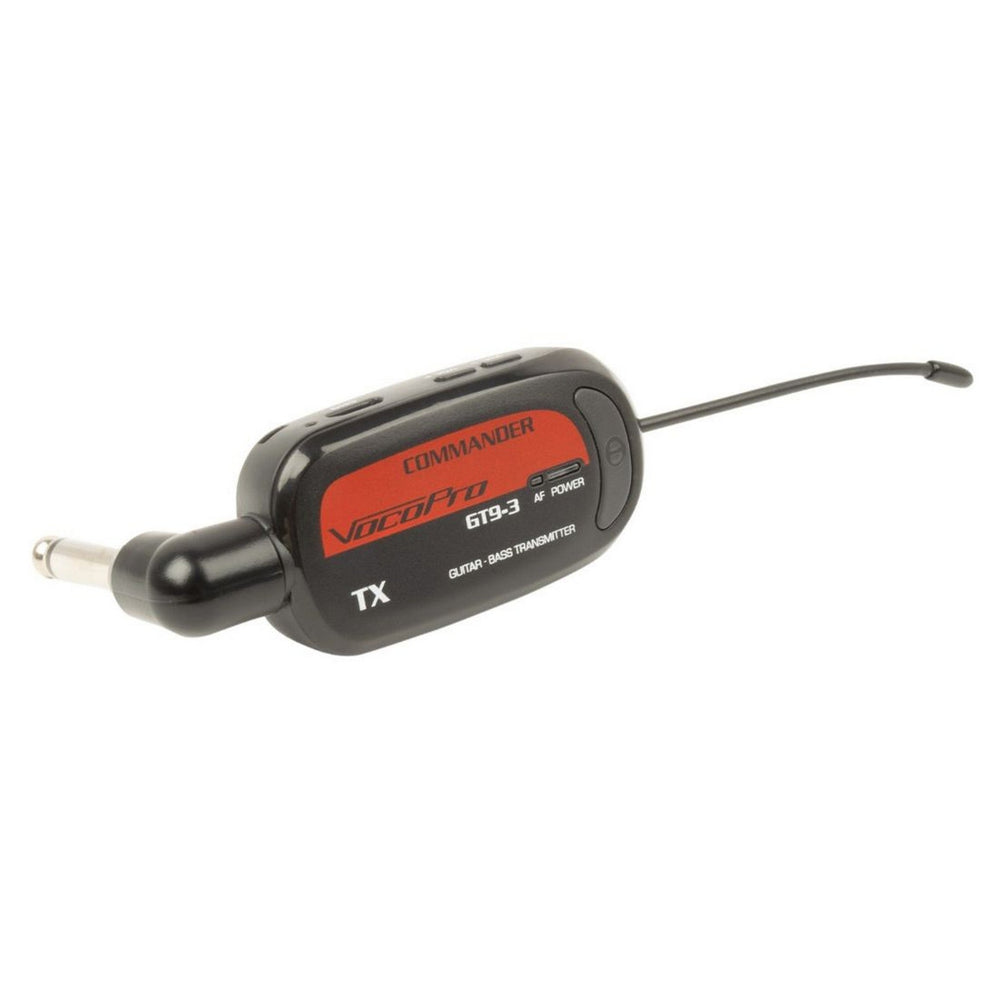 The VocoPro Commander-GT-9 is a UHF wireless guitar transmitter designed for seamless integration with VocoPro's Commander series receivers. Featuring a 1/4-inch plug set at a 90-degree angle, it easily connects to guitars with front-mounted jack plates, providing a secure and unobtrusive fit during performances.