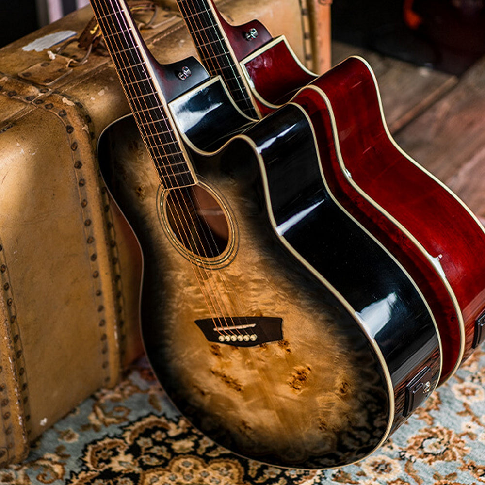 Ready for the stage, studio or practice room, the Deep Forest Burl ACE will quickly become your go-to acoustic. When the wood blends of the Burl ACE are coupled with the size, shaping, and bracing of this auditorium cutaway, you enjoy clear articulation and a versatile tone. With the integrated Barcus Berry active electronics, the Deep Forest Burl ACE delivers easy-to-achieve great guitar tones plugged-in or unplugged.