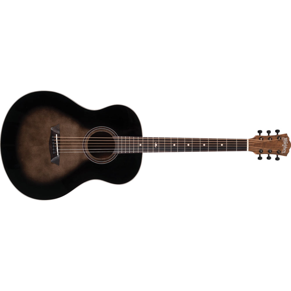 The Washburn NOVO S9 Studio Body Acoustic Guitar serves as the introductory model in the Bella Tono series, showcasing a captivating high gloss charcoal-burst Spruce top paired with figured Walnut back and sides. With the Washburn Studio body design, players enjoy a comfortable experience while still experiencing the rich lows, clear highs, and focused mids typical of larger body guitars. The 25.5" scale length provides a sense of familiarity, and the satin-finished Okoume neck with a modern "C" profile feels smooth and cozy. Adding a touch of elegance, a subtle Lotus inlay graces the ebony fingerboard at the 12th fret, while the understated black and white binding enhances the instrument's overall striking appearance.