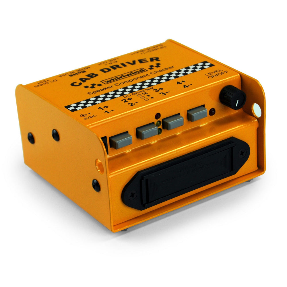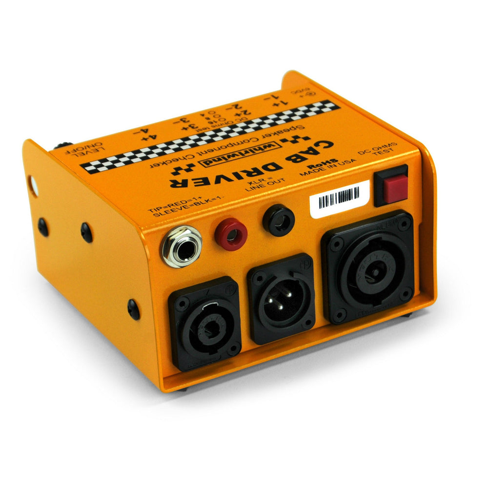 The CAB DRIVER is a test device for checking the operation of the speaker components within enclosures. A pink noise signal source is sent through pushbutton selectors to an assortment of speaker connectors, including Speakon NL8 and NL4, 1/4" TS and banana jacks.