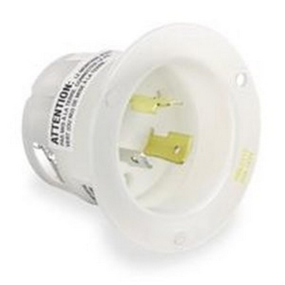The HBL2315 is a 3-pole 3-wire 20A/125V Twist-Lock NEMA L5-20P Insulgrip Grounding Flanged Inlet, made of white nylon casing, back wired, brass blades, #10-32 brass Phillips/slotted/Robertson screw terminals.