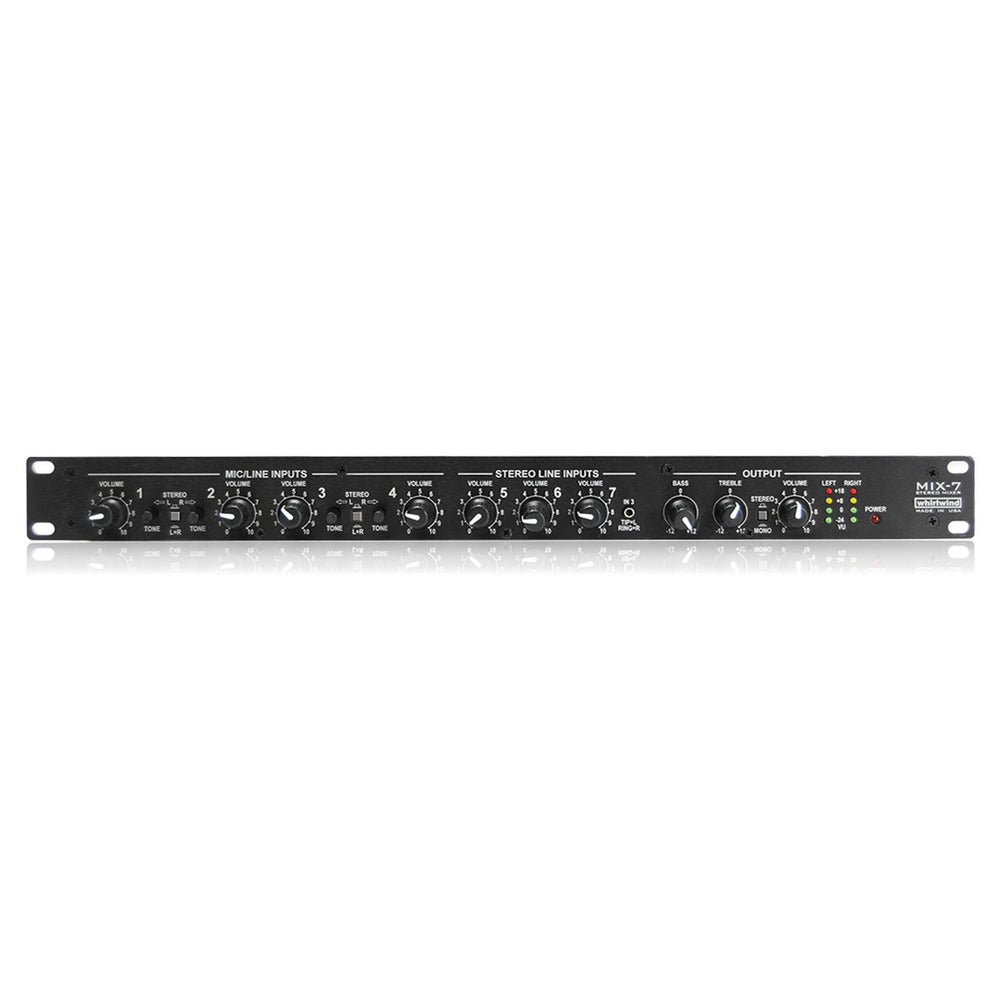 The Whirlwind Mix-7 is a versatile stereo mixer, combining four mono mic/line inputs and three stereo line inputs, in a compact, easy to use one rack space package. The Mix-7 provides up to 76 dB of gain, professional quality signal to noise ratio and full frequency response. Designed for use anywhere microphone and music sources need to be combined, the Mix-7 is ideal for use in broadcast production, sports facilities and banquet rooms. Features include stereo/mono switching, a tone control on each of the mic/line inputs, two place master EQ, metering and a stereo/mono switch on the main outputs.