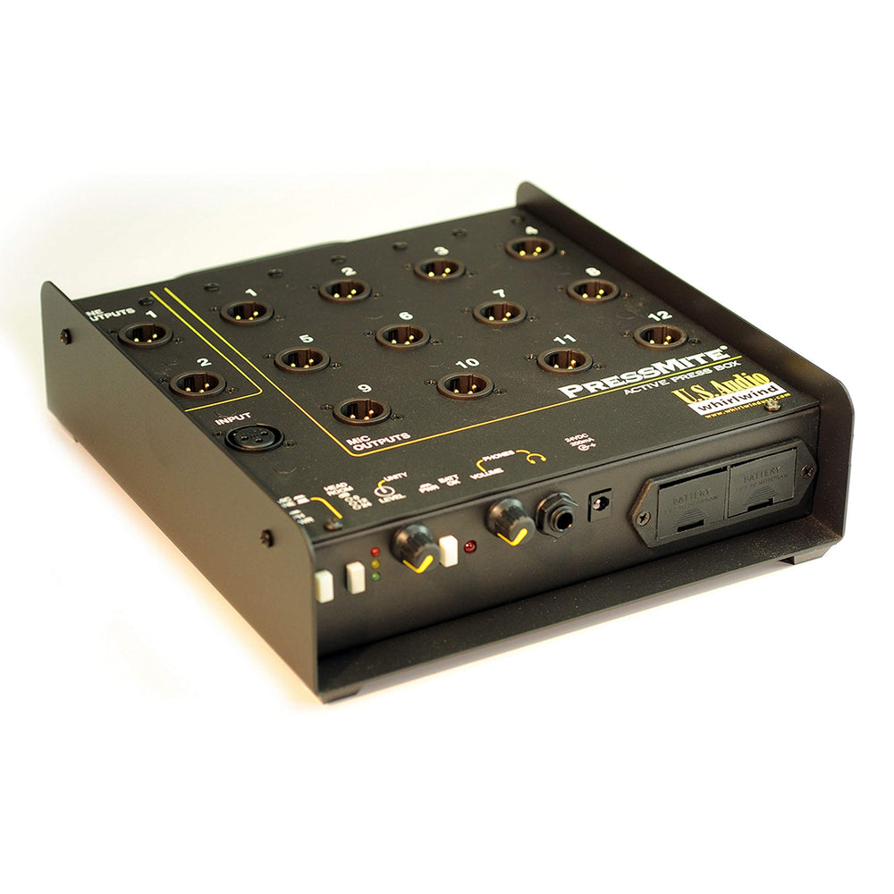 In MIC input mode, 18V phantom power is selectable and a three segment LED headroom display speeds level adjustment. If more outputs are needed, PB Series Press Boxes can be connected to the line outputs to provide up to 48 additional mic outputs. The PressMite's box is built to withstand the abuse of public events.