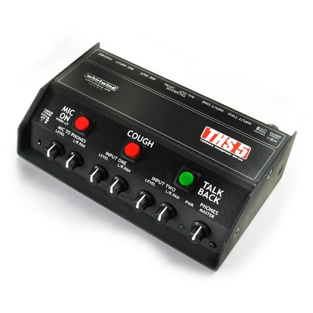 The THS 5 has both main and talkback microphone outputs. A latching Mic On/Off switch connects signal to the Mic Out. The red light is illuminated when the Mic Out is live and is turned off by the cough and talkback switches. Two types of onboard condenser microphone power are available, enabling seamless switching when talkback is activated. A three way switch selects either phantom or "T" power and is recessed to avoid accidental turn off.A momentary Cough switch silences both the Mic Out and the talkback out when depressed. The momentary Talkback switch connects the mic to the talkback output and mutes the Mic Out. The announcerās microphone is sent through a preamp and line driver that deliver signal to the talkback output at line level. There is a level control for fine adjustment of the audio sent down the talkback line. The Talkback switch illuminates green when depressed.