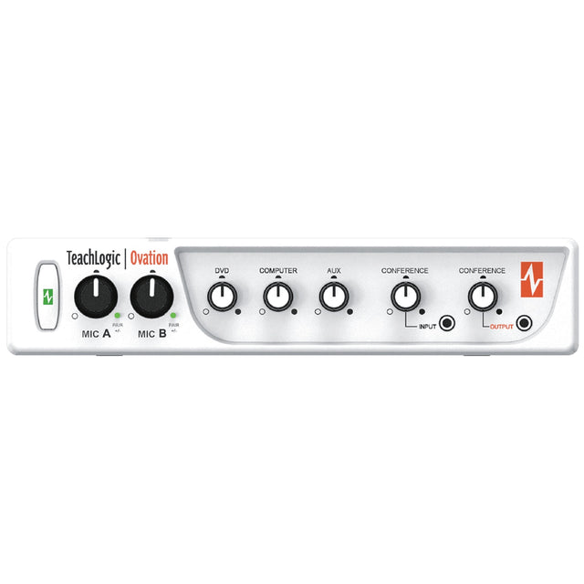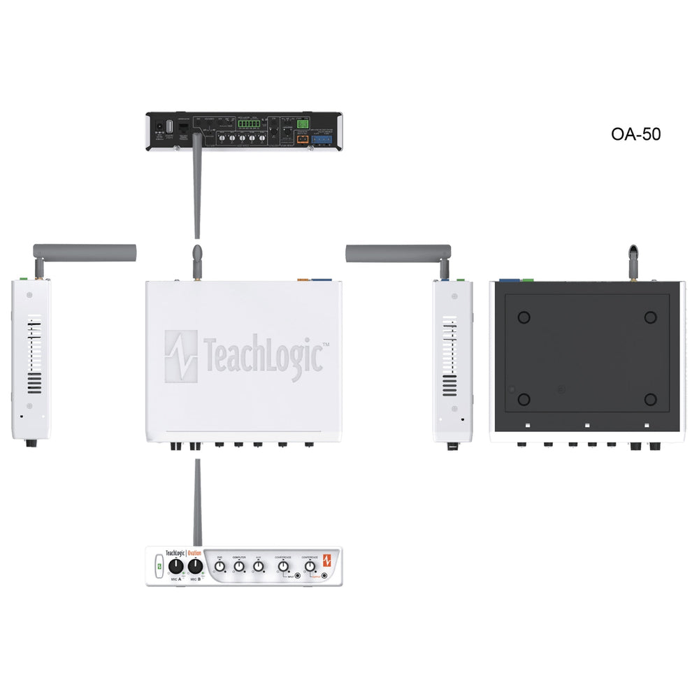 The Williams AV OA-50 is a classroom-focused receiver/amplifier/mixer that integrates a dual-channel DECT 6.0 wireless mic receiver with a 50-watt (2 × 24.5 W @ 4 Ω) power amplifier. It supports four 3.5 mm audio inputs, conferencing I/O with EchoGuard™ echo prevention, and outputs for assistive listening and lesson capture—providing clear, evenly distributed sound for typical classrooms up to about 2,000 sq ft.