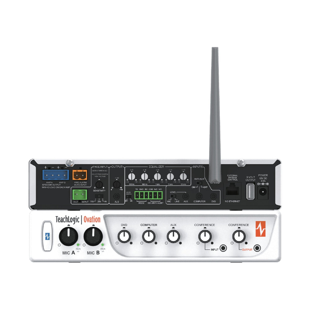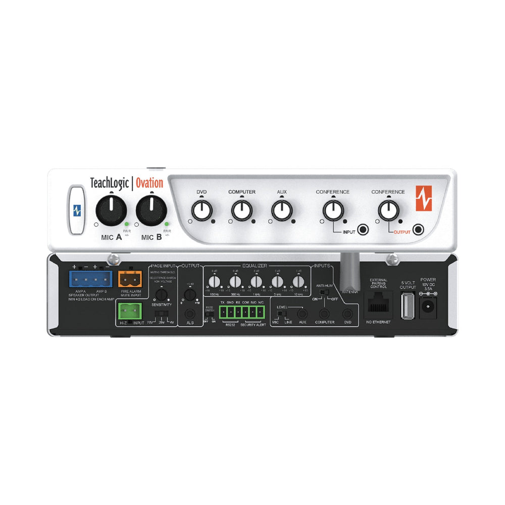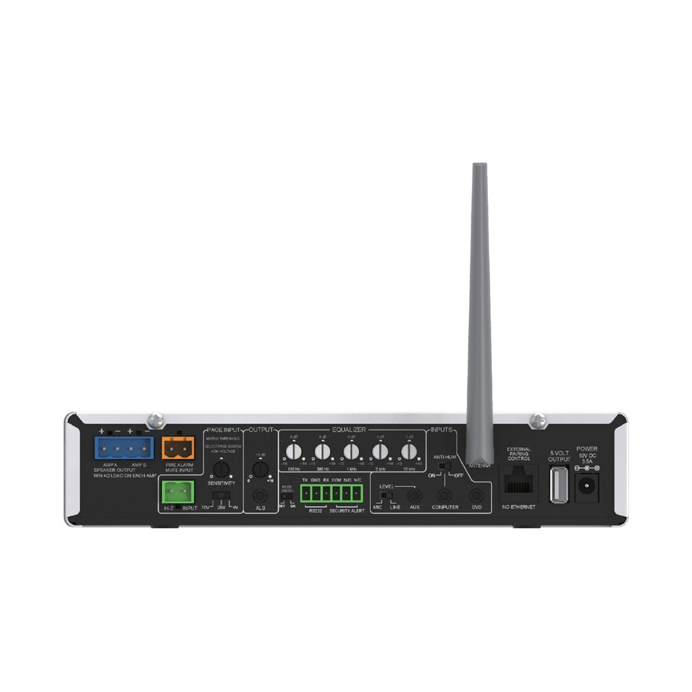 - Amplifier: 50 W RMS at 4 Ω (2 × 24.5 W channels); powers up to four 8 Ω classroom speakers.