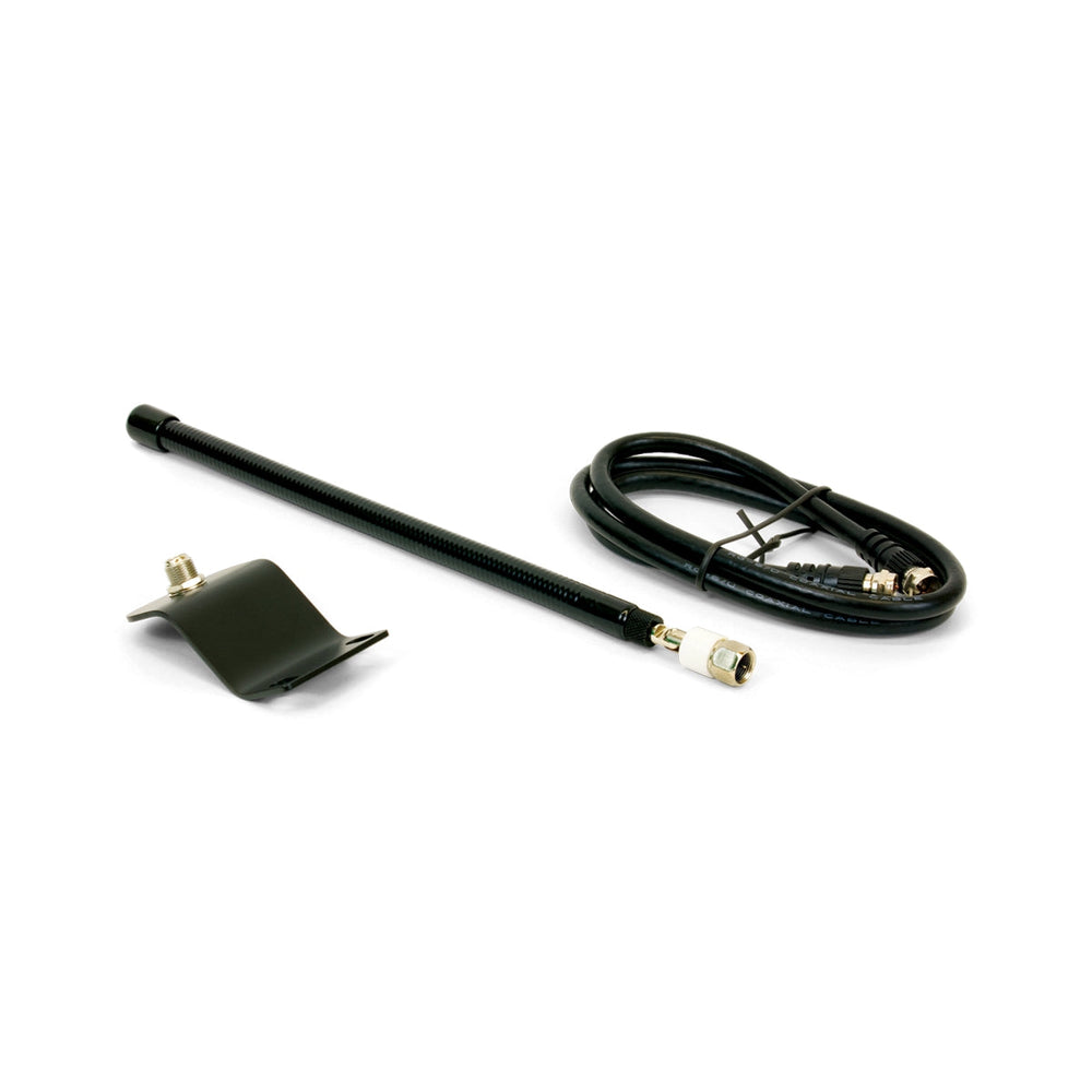 Rubber Duckie Antenna, 72-76 MHz FM, F-Connector, with mounting bracket and coaxial cable. RoHS compliant. Use with large-area FM transmitters.