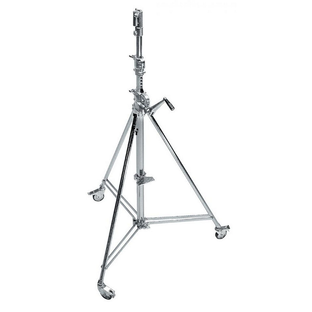 This heavy lifting stand in chrome steel features 3 sections, and 2 risers. It is provided with a wind up handle and has 1 leveling leg, and braked wheels. With a maximum payload of 30kg, it can also raise up to 3.70m. It also features 1 step on the column for better stability for the operator.