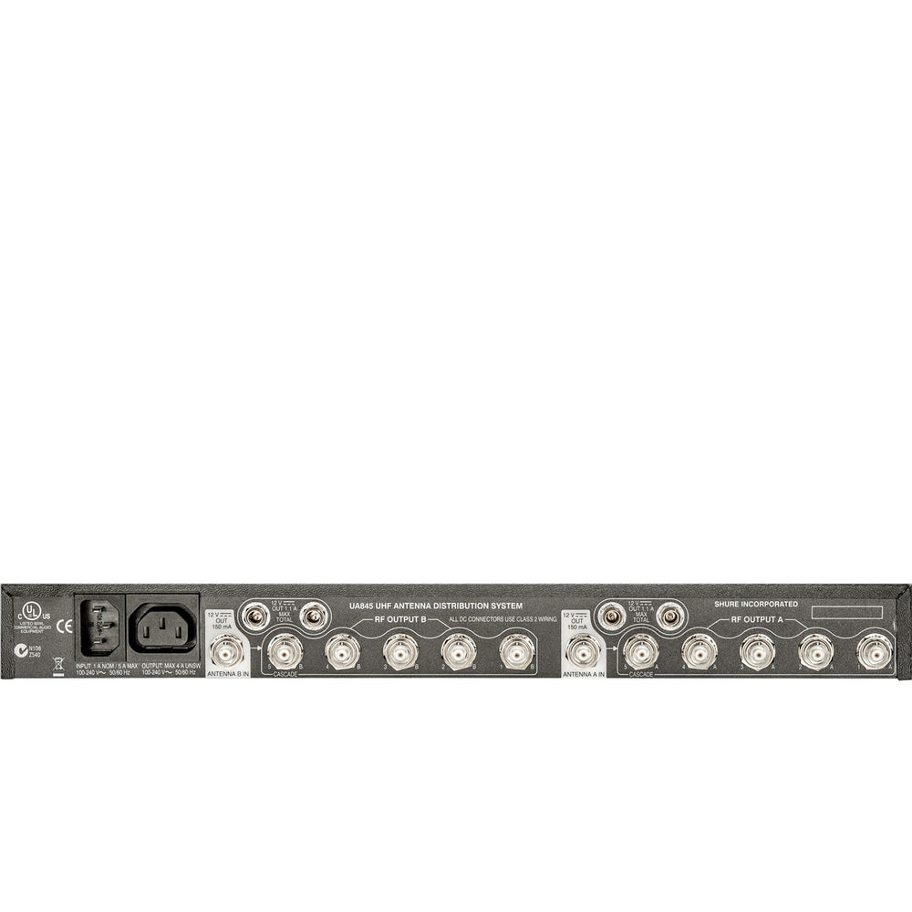 Engineered to enhance the performance and reliability of your wireless setup, the UA845-SWB ensures robust signal strength and uninterrupted connectivity. This versatile distribution system is compatible with all Shure UHF, UHF-R, and ULX-D wireless receivers within a compatible frequency range. With two 50 Ω BNC-type CASCADE ports, the UA845-SWB facilitates easy integration of additional units or a fifth receiver, making it a must-have for audio professionals handling complex wireless environments.