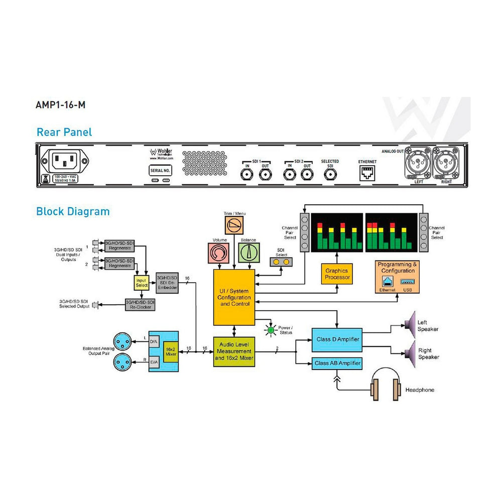 Wohler's newest audio monitor offers fast, intuitive operation for monitoring SDI audio in the most demanding production applications. Whether in the studio or on the road, the AMP1-3G provides instantaneous selection and summing of any grouping of SDI audio pairs. It features adjustable volume and balance controls, clear display of levels, and phase indications on bright 2.4î LED-backlit LCD displays, with configurations that can be created, saved and recalled via Ethernet connection using an intuitive PC interface.