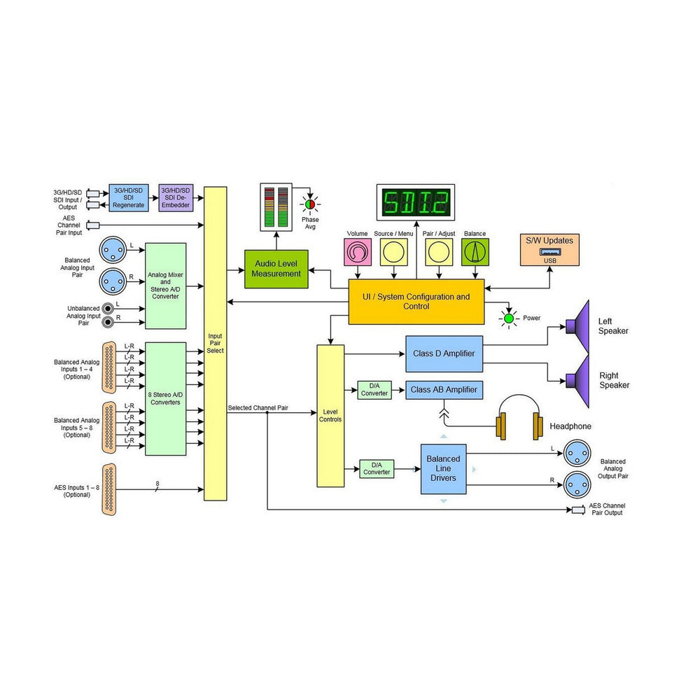 One 3G/HD/SD-SDI Input on BNC, One looped-through SDI Output on BNC, One AES Input on BNC, Two unbalanced analog Inputs on RCA, Two balanced analog Inputs on XLR-F, Two balanced analog Outputs on XLR-M (follows selected source), Eight balanced analog Inputs on 2 x DB25 (option), Eight AES Inputs on 1 x DB25 (option), 1 headphone (1/4" jack)