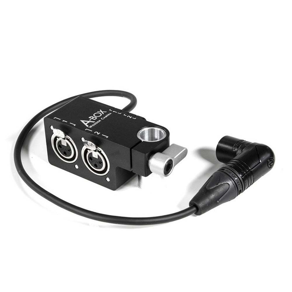 A-Box (ARRI Alexa) adapts one 5 pin XLR to two balanced, 3 pin XLRs (female). Highest quality professional grade connectors.