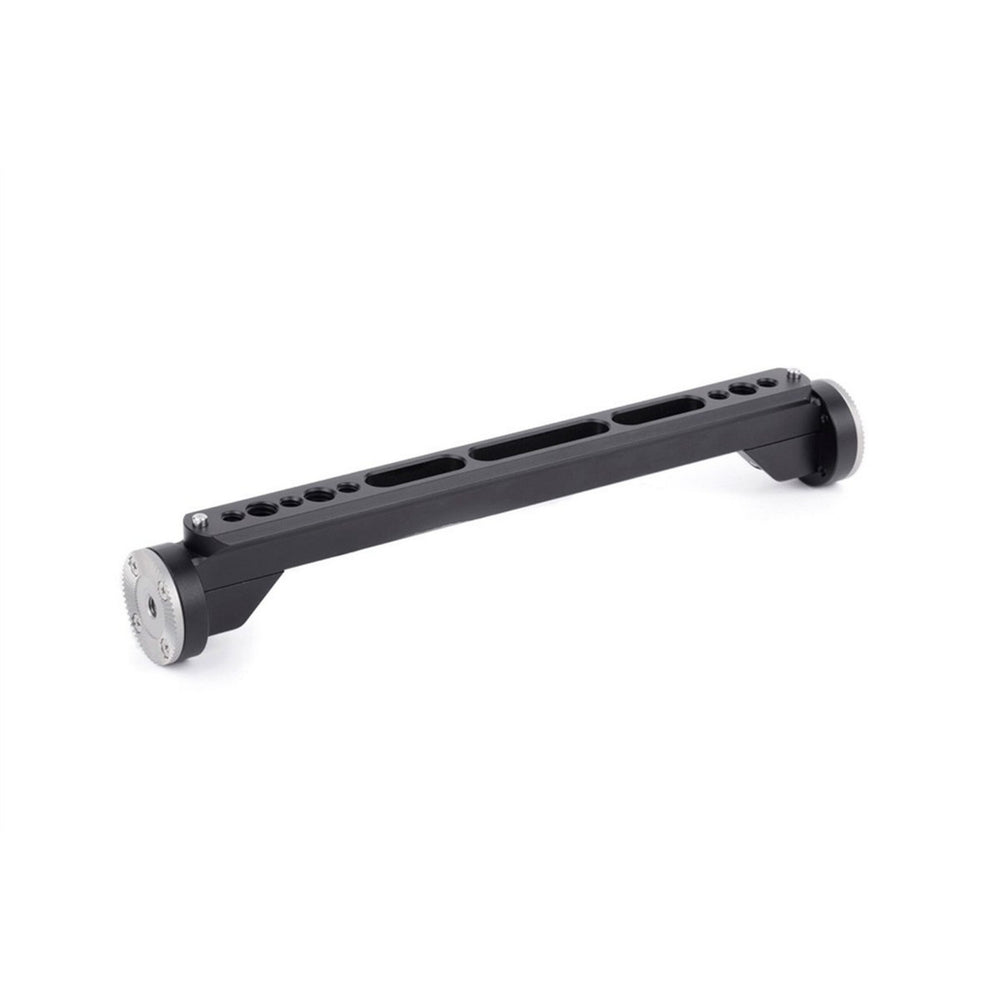 Crossbar v2 Kit consists of a NATO rail on top with safety pins on each end, 1/4-20 and 3/8-16 holes for attaching accessories, 1/4 inch pass through slots for attaching to cheeseplates and rod clamps, and ARRI standard rosettes on each end for attaching Rosette Arms and Rosette Grips.