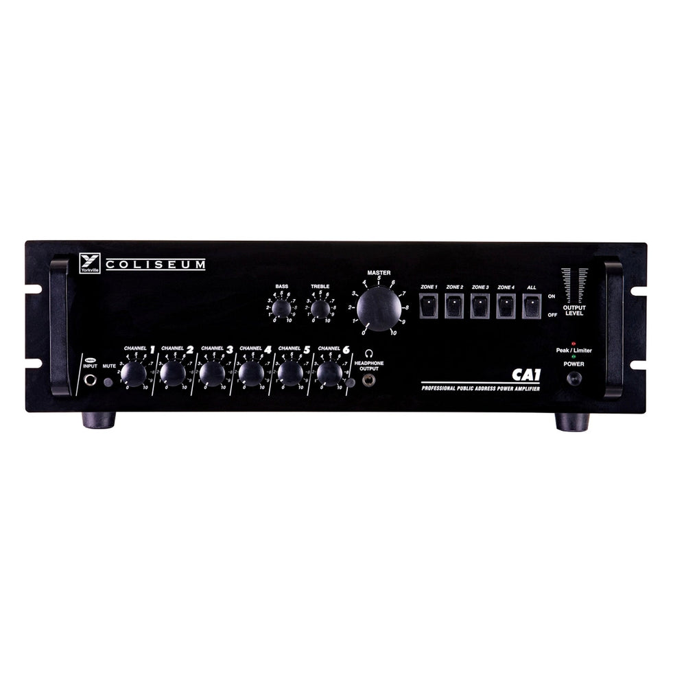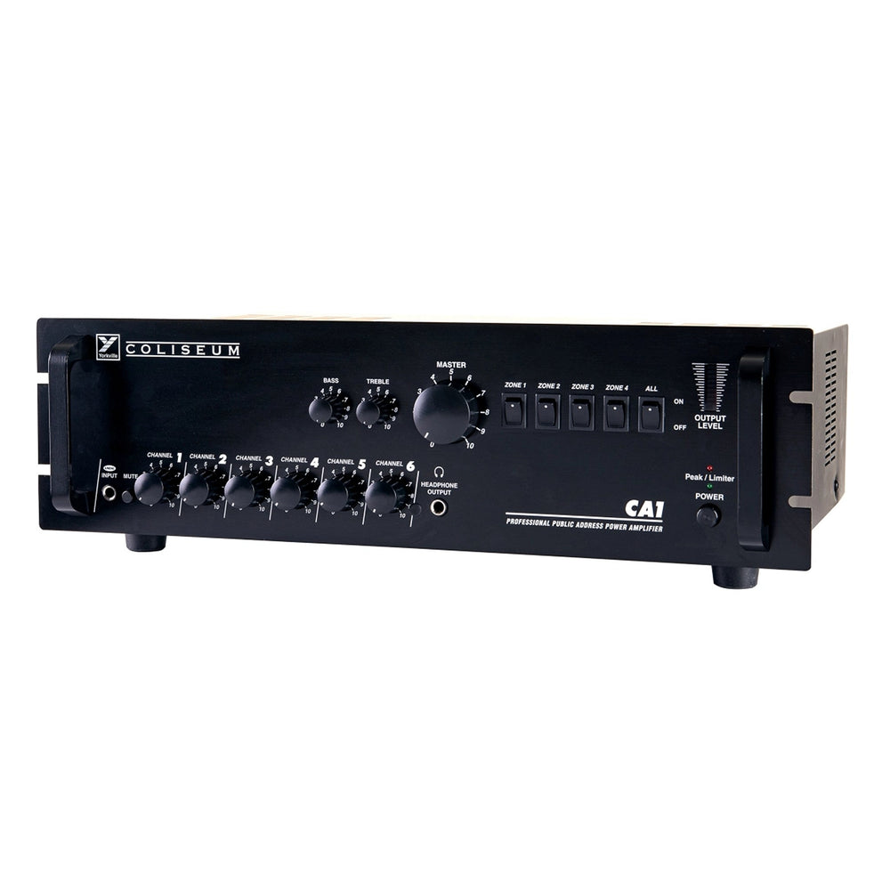 The Coliseum CA1 public address amplifier has been designed specifically for installations where a versatile paging system with high quality music playback is required. Ideal for restaurants, small clubs, offices and retail environments where a simple and reliable system capable of servicing multiple paging zones is required. Multiple inputs for microphone or source material, and voice activated paging from either a microphone or telephone matrix means the CA1 can be used in virtually any application.
