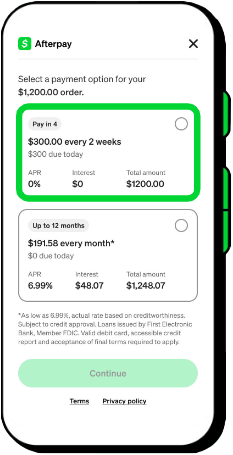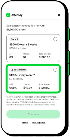 Afterpay Monthly Payment is a simple interest installment-based lending option that gives you more flexible ways to pay for high-value orders. Depending on your eligibility, Pay monthly offers flexibility with a 6 and 12 month interest-based payment option on items over $400. Interest accrues on the unpaid principal balance on a daily basis. Please note, until an offer is accepted rates and offers are subject to change