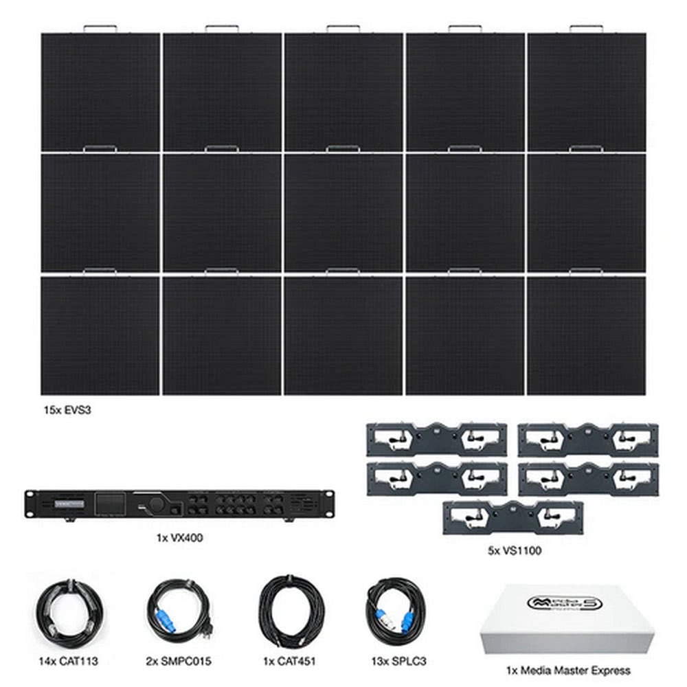 The EVS3-5x3 by American DJ is a comprehensive LED video wall package featuring fifteen EVS3 panels arranged in a 5 x 3 configuration (approx. 100" x 60" or 8.5 ft x 5 ft). Ideal for impactful visuals at events, trade shows, or presentations, it includes everything required for setup—video panels, processor, power & data cabling, rigging bars, and control software (computer not included).