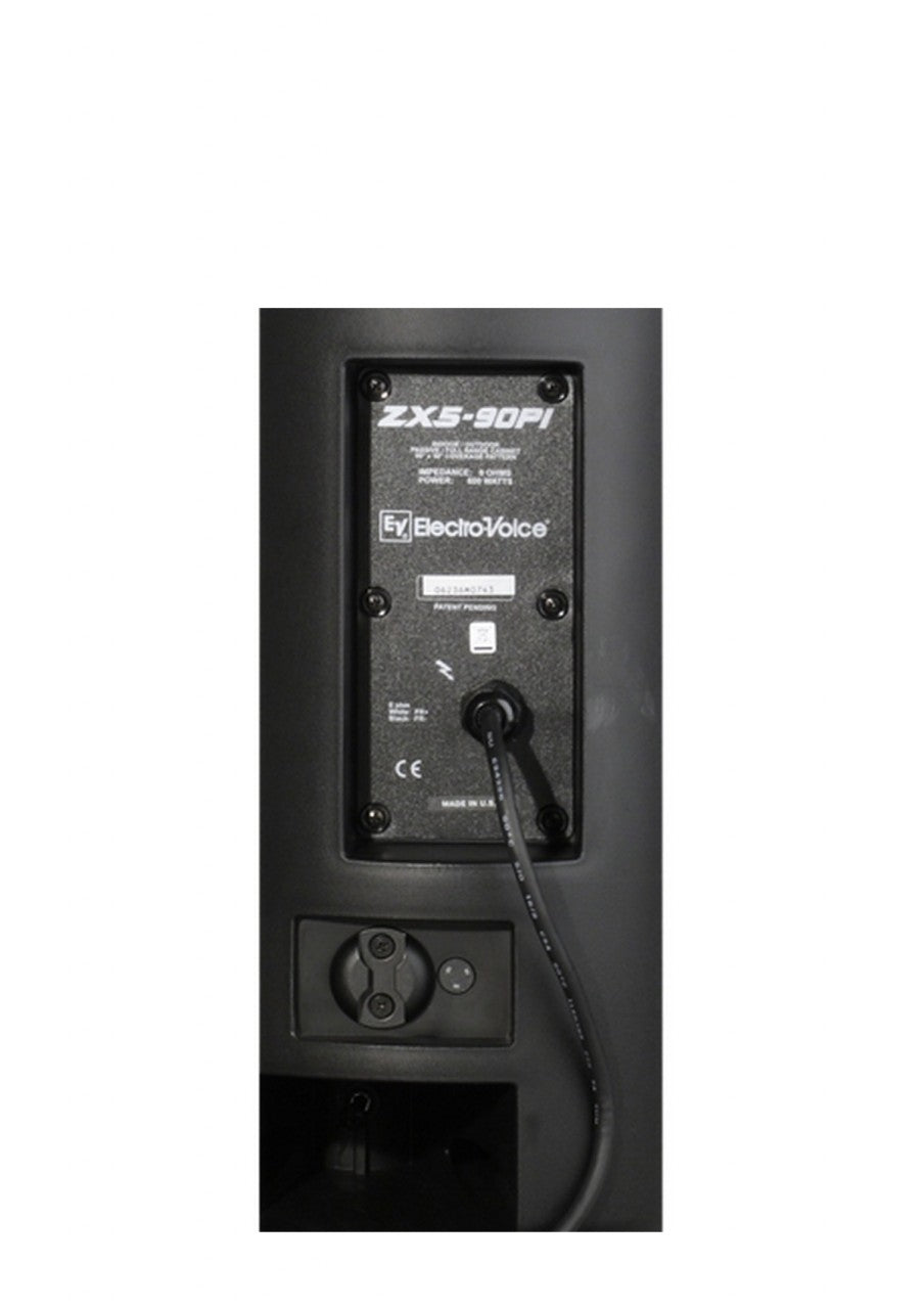 The Electro-Voice ZX590PI All-Weather 15-Inch Two-Way Passive Weather-Resistant Loudspeaker System features a molded polymer enclosure that is inherently water resistant. The addition of a multilayer grille with hydrophobic cloth and a gland nut input connection completes it for a highly weather resistant system. The Zx5 is the new standard of no compromise audio performance and versatility in a simple to use, compact package. At its heart are the transducers. First is the DVX3150 high performance low frequency transducer. EV used advanced computer aided design techniques to create forced air, directional voice coil cooling for high power and efficiency. Finite element analysis was used to optimize the suspension and magnetic structure for long, linear travel to provide low distortion and greater LF extension. These features and details, such as forged magnetic components and special materials, provide reliability with a 500W power rating in a lightweight transducer. Next is the ND2, a 2-inch voice coil compression driver based on neodymium motor structure to allow for maximum output while reducing size and weight to a minimum. Its precision phasing plug and titanium diaphragm provide better HF performance, while the integral heatsink provides cooling for high power output. The high tech enclosure uses injection-molded high-impact polypropylene structural foam to make the Zx5 incredibly durable. The enclosure geometry elements have been carefully designed to provide maximum rigidity and bass response. Two coverage patterns are available; 60° x 60° coverage for long-throw and cluster applications, 90° x 50° coverage for wider coverage or shorter distances. The Zx5 is equipped with three anchor plates for rigging with single stud-fittings, along with two more possible anchor plate attachment points on the bottom. For permanent suspension or attaching brackets, the Zx5 also has two M8 inserts on the top and bottom, two under the handle, and four on the back of the enclosure, for a total of 10.