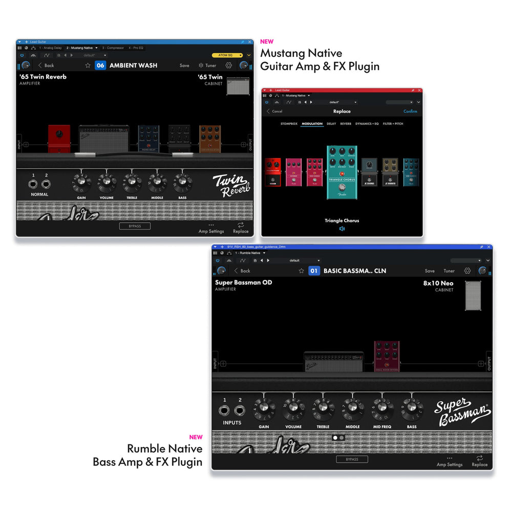 - Fender Amp and Bass Plug-ins: Includes Fender Mustang Guitar and Rumble Bass plug-ins with amps, cabinets, pedals, and presets.